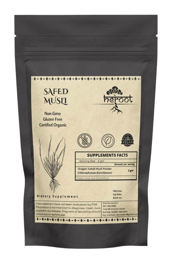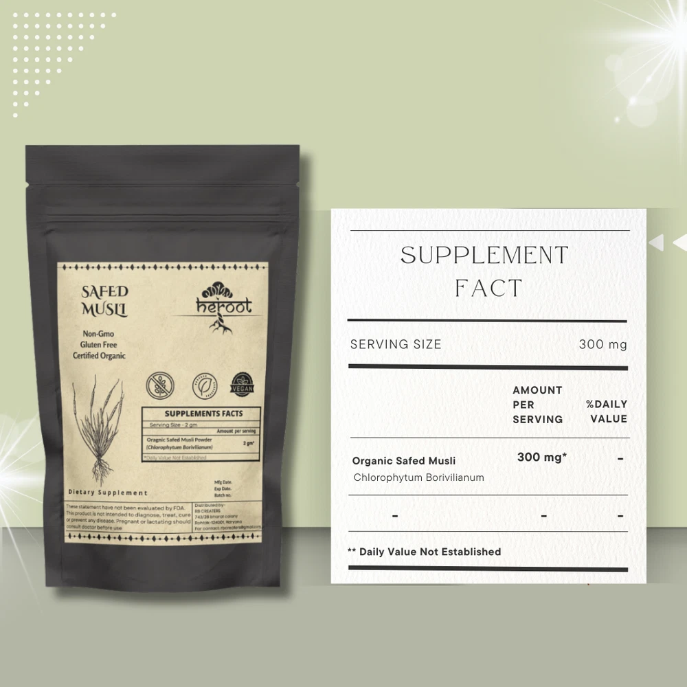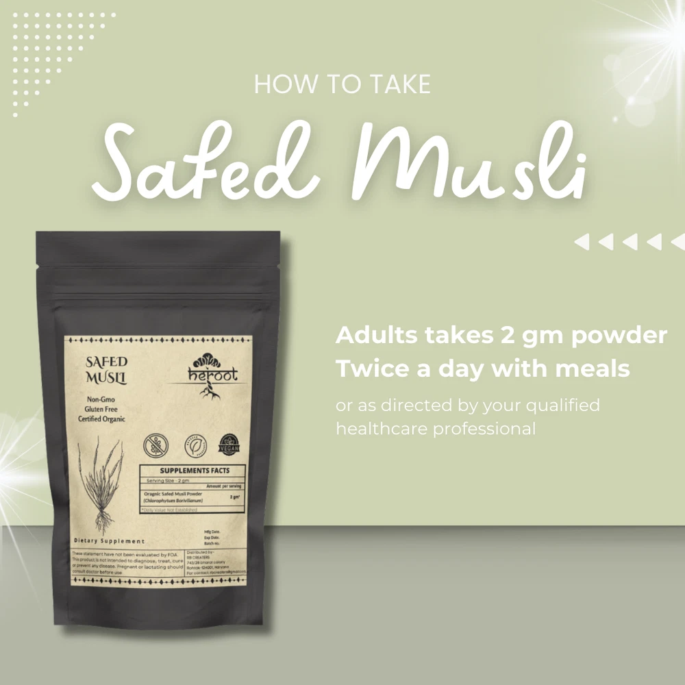 Heroot Organic Safed Musli Powder Safed Musli helps to increase strength, immunity. An ancient ingredient that is traditionally used for enhancing strength and stamina. Safed Musli is an ancient ayurvedic herb primarily used as a tonic and rejuvenative for the reproductive system. It may be beneficial in managing premature ejaculation, impotence and low sperm count in men. Key Ingredients: Safed Musli Key Benefits: · It helps in enhancing vigour and vitality in the body It may be useful in improving libido · Useful in maintaining overall strength and performance · Beneficial in body building and increasing body strength It helps in relieving stress in the body Directions For Use: Consume 1/4 tsp (3-5 gm) with lukewarm water after a meal Or as directed by your healthcare provider How To Consume: Can be mixed with warm milk & honey Can be taken with juices & smoothies Can be taken directly with honey · Can be filled in capsule and consumed with water Safety Information: · Store in a cool dry place · Keep out of reach of children · If you are pregnant or lactating or prone to any food allergy or under any medical condition consult your healthcare practitioner before use Disclaimer The above description is for information and knowledge purpose, not a healthcare professional advice. Please consult your doctor and/or pharmacist before you take this vitamin. Pregnant or lactating women, diabetics, hypoglycemics, and people with known medical conditions and/or taking drugs, should consult with a licensed physician and/or pharmacist prior to starting any supplementation program. The above statements have not been evaluated by the Food & Drug Administration. Shipping and Handling 1. Shipping time will be 1 business day after the cleared payment 2. We will ship by Indian Post service 3. Shipment will take 15-30 days. Few more days for your local customs delay and formalities. 4. For Express service additional charges will be applied. For any reason you wish to leave Negative or neutral feedback, Please contact us first and let us mutually resolve it. We care for your satisfaction and will make sure that you are happy with the transaction to post us 5**** ratings in all areas. ***Customs Information*** Heroot will not be liable for packages refused or held by customs for delivery. We request that you contact customs office and ask about import regulations and restrictions before placing your order. It is importsnt for you to become familiar with customs policies for your specific country before ordering. Customs regulations differ by country and not knowing their regulations can result in your order incurring high import duties, the delivery being delayed or even returned. Please check with your customs office to see if your country permits the shipment of the products you are planning to order from us and if any additional licenses or permits are needed. Please note: if your order is returned to us due to banned/ restricted products policy, a wrong address, refusal to pay customs fees, refusal to accept the order or because no one was there to accept the delivery of your order, we will refund your order as follow: you will be refunded the total amount of the order, minus the original shipping charge .