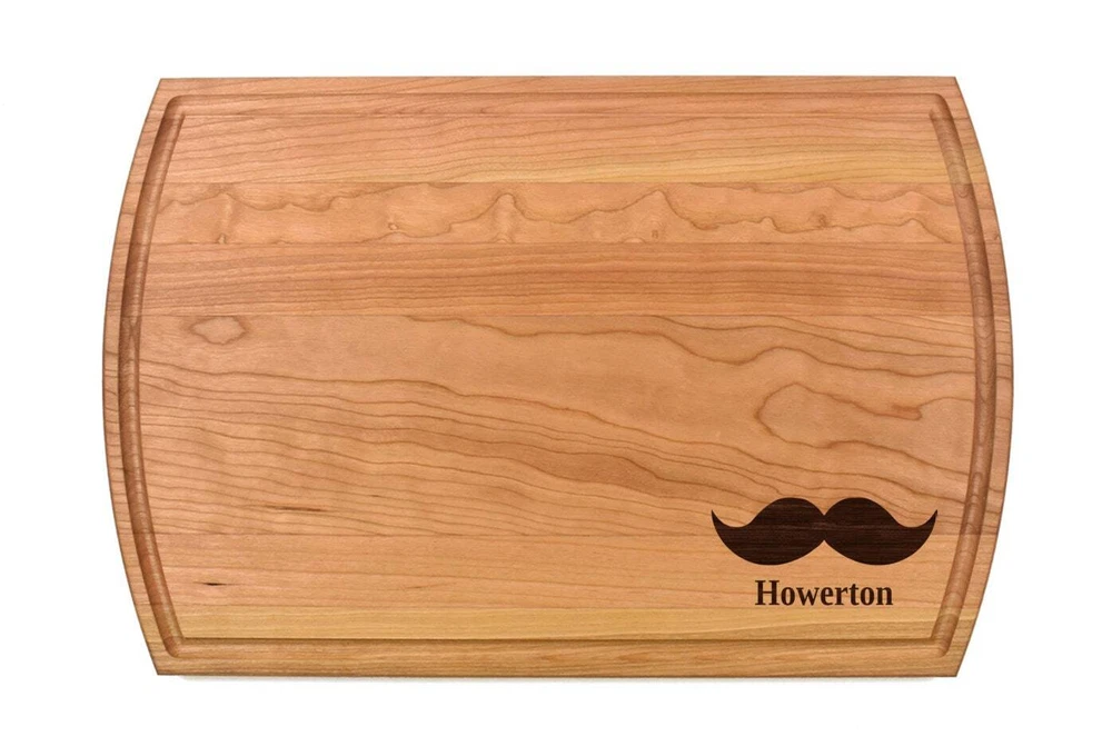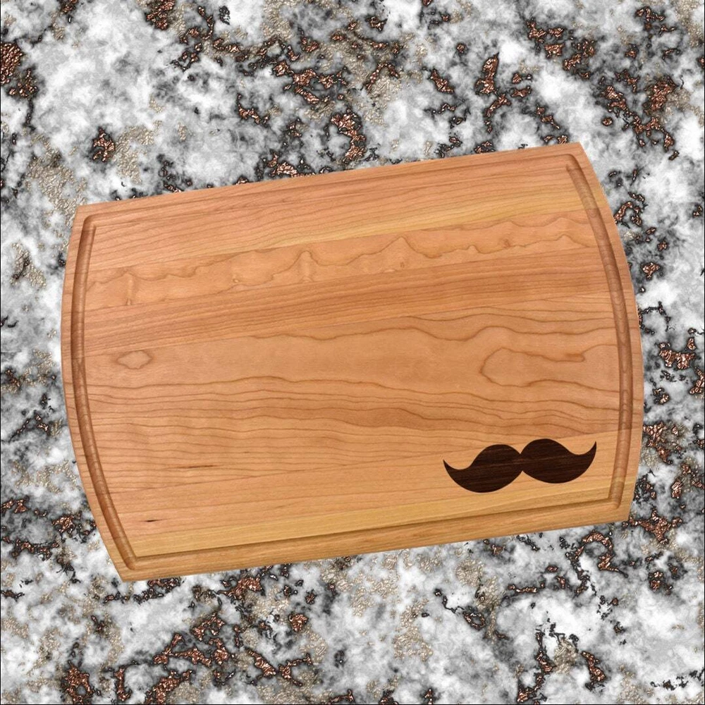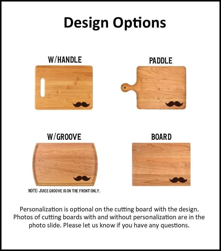 Design: Personalized Mustache Cutting Board or Charcuterie Serving Tray All items ship via USPS - please make sure your address is correct :-) Whether used as a charcuterie serving tray for snacks or cutting board, our bamboo, walnut and cherry custom boards are the perfect addition for the home and make the perfect gift for your loved one celebrating a birthday, anniversary, new home, wedding, etc! *** FEATURES *** • SIZES: We have multiple styles and sizes available. To see our current sizes available, click the drop-down menu. The photo slide contains a photo showing each side by side. Please note, the board with the juice groove only has the groove on the front side of the board. • THICKNESS: Bamboo Boards - Approximately 1/2" Thick; Walnut & Cherry Boards - Approximately 3/4” Thick • UNIQUE: Every board is unique with the grain and coloring varying throughout - no board is the same! • CARE INSTRUCTIONS: Hand wash only with warm water. Do not soak. Please apply mineral oil throughout the board’s life. • PERSONALIZATION/CUSTIMIZATION: Do you want the text placed differently on the board? Please don’t hesitate to contact us. All personalization notes can be entered in the personalization box when checking out. • SHIPPING: All cutting boards ship within 2 to 5 business days. • WHOLESALE ORDERS: Please don’t hesitate to contact us for information about wholesale orders. Processing times for larger orders may change. • NOTE: Colors can vary a bit on different monitors and screens. Any props included in photos are not included. Please be sure to double-check your address to make sure it is accurate for USPS delivery. If a package is returned to us due to an invalid address, the buyer is responsible for all additional shipping charges. We appreciate you supporting small business – best wishes! For items ordered with simple edits, we do not send proofs since the layout doesn't change from the example(s). However, in the event there are requests that change the layout from the example(s), we do send proofs for approval before making the product. If you'd like a proof before we make the product, please note so in the personalization box.