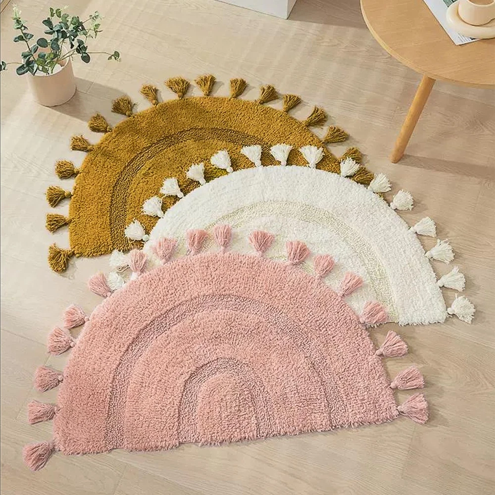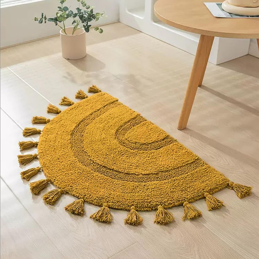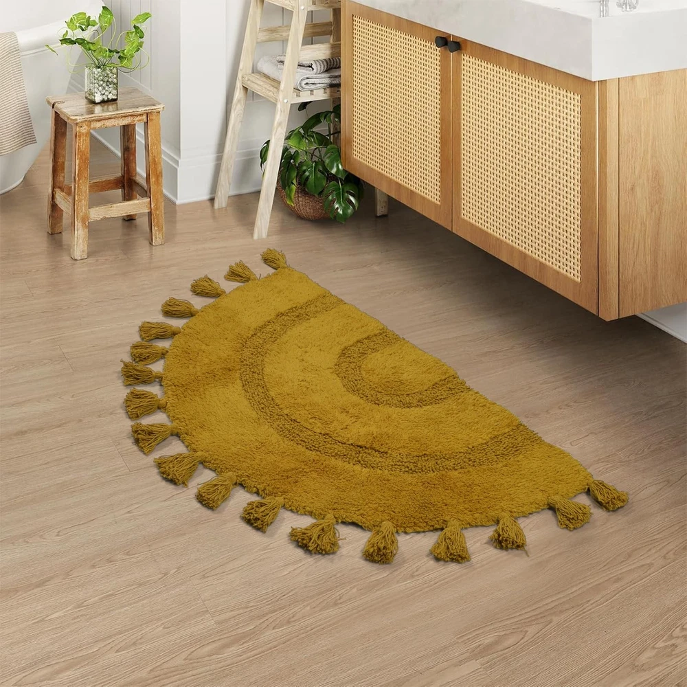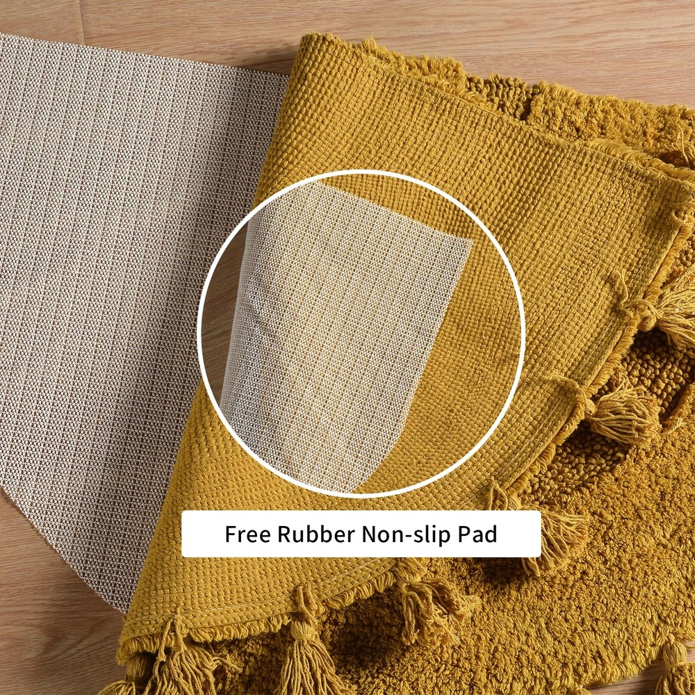 【Cotton Bath Rug】The boho bathroom rug is made of 100% cotton and non-slip bottom pad, semi-circular bohemian style with hand-woven tassels, make this bohemian bath mat look both cute and fun. When you step out of the tub or shower room, keep your feet dry and away from cold floors 【Boho Bath Mat】The boho bathroom rug is shaggy and super soft, made for Long-Lasting Absorbency and Comfort. The plush looks very comfortable. Whether you like bohemian style, simple style, it is your best choice 【Non-slip Bath Mat】Includes 1* bohemian bath mat + 1* non-slip mat. Perfect for gripping all kinds of floors and also help avoid scratches on the floor in daily life. It is strong non-slip, if there are elderly people, children or pregnant women in the home. this non-slip floor mat is the best choice and can be used continuously for a long time 【Bohemian Decor】This bohemian rugs can be used in multiple places at home, It is the best bathroom mat and the floor mat in the family, It is also laundry room mat, kitchen mat. Suitable for bathroom, sink, kitchen, laundry room, living room, bedroom, entrance, etc. Great as a gift for family and friends at Christmas, Mothers Day, Fathers Day, Valentine's, and Wedding 【Easy To Clean】Machine washable in cold water and mild detergent, tumble dry on low temperature, tested for no shedding or fading. The newly upgraded fiber locking technology and reinforced stitched hemming solve the problem of fiber shedding. This like new after cleaning