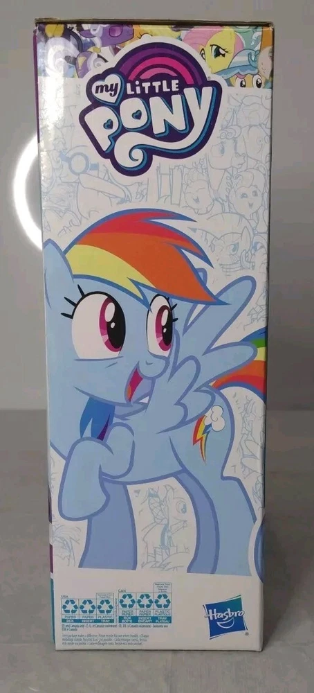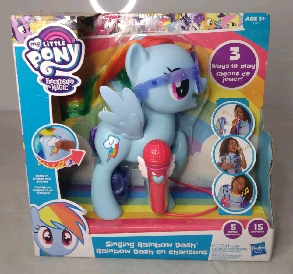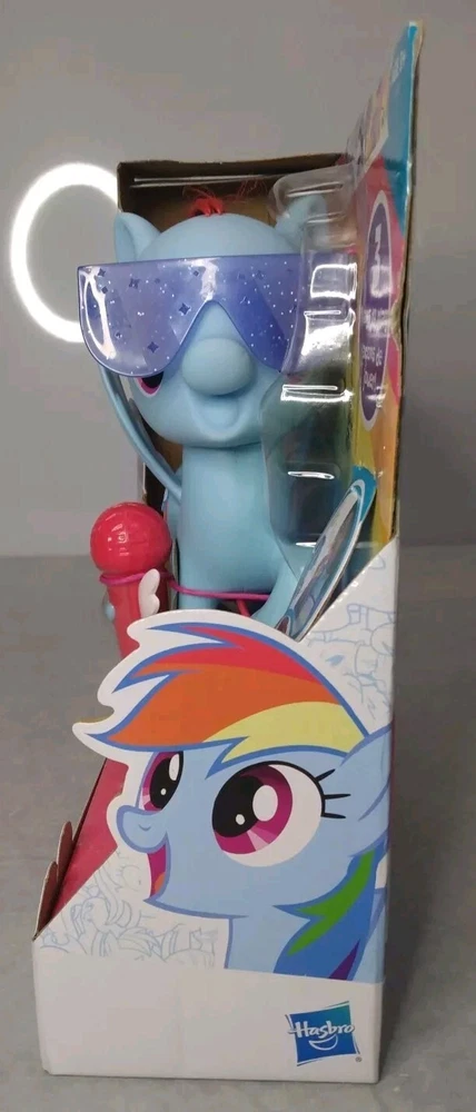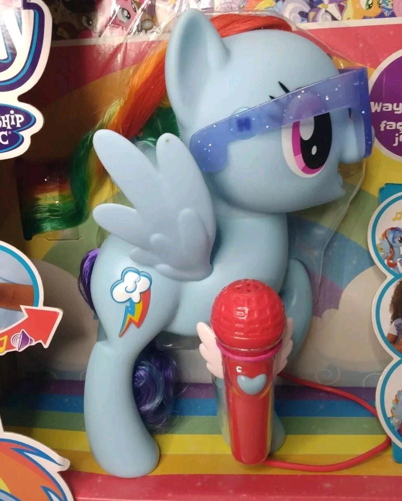 My Little Pony Friendship Magic Singing Rainbow Dash BNIB is a colourful action figure featuring everyone's favourite character, Rainbow Dash, from the beloved TV show My Little Pony. This multicolored figure comes with a microphone for added playtime fun. Made of vinyl and plastic, this 2016 manufactured toy is suitable for children aged 3-4 years. With the ability to sing, this original Hasbro product is a must-have for any My Little Pony fan.