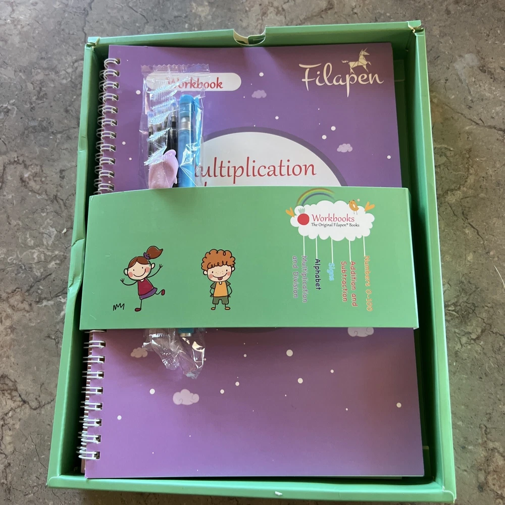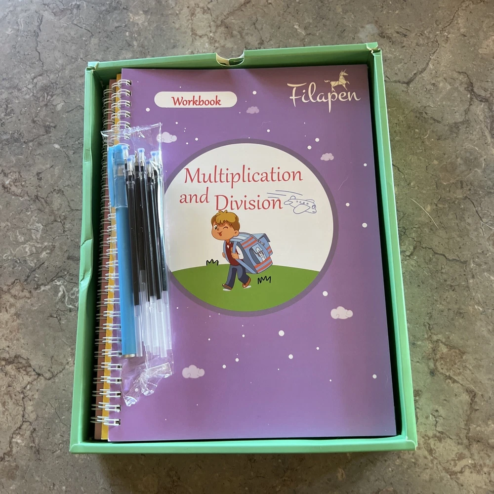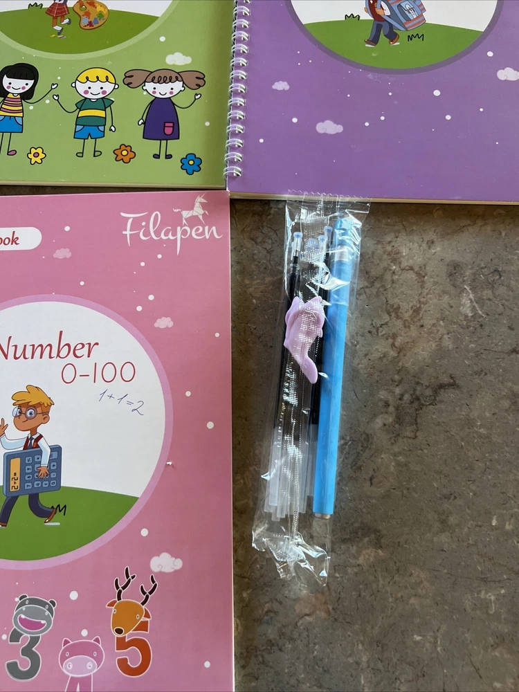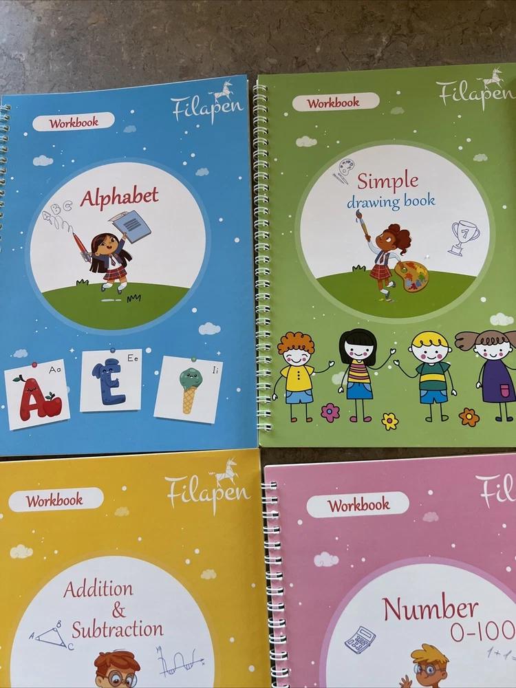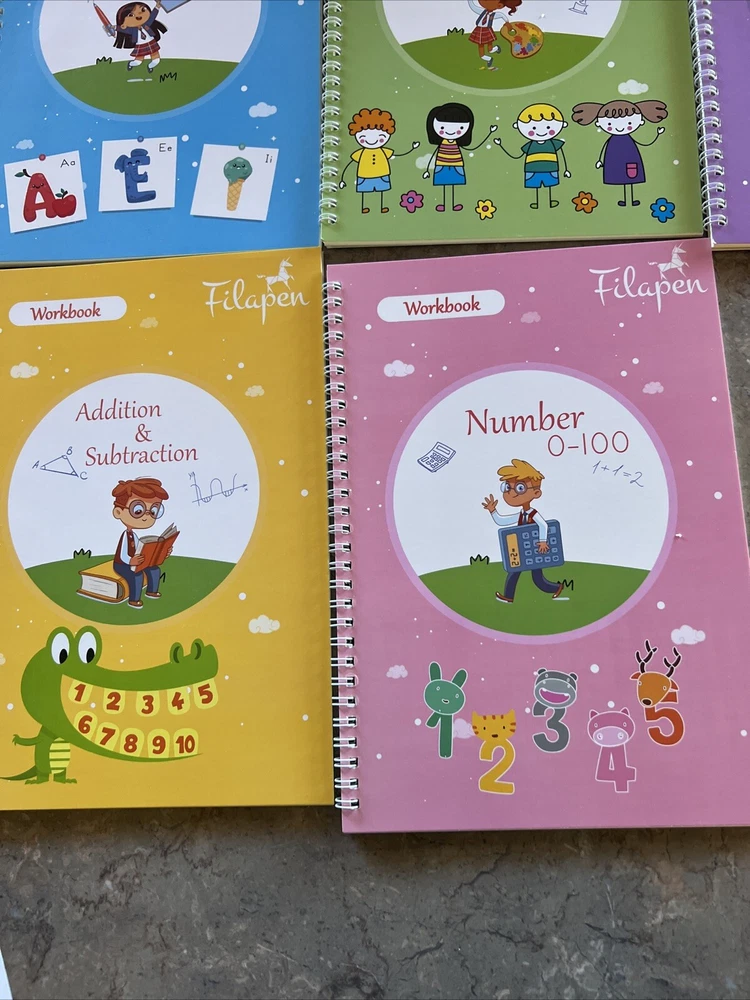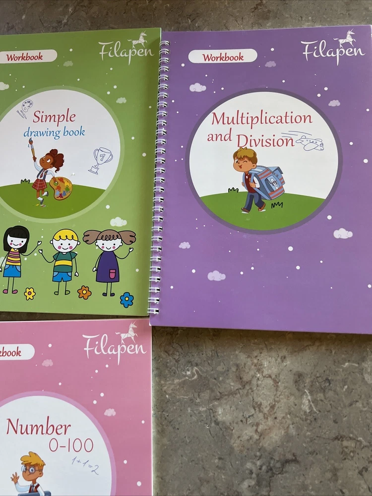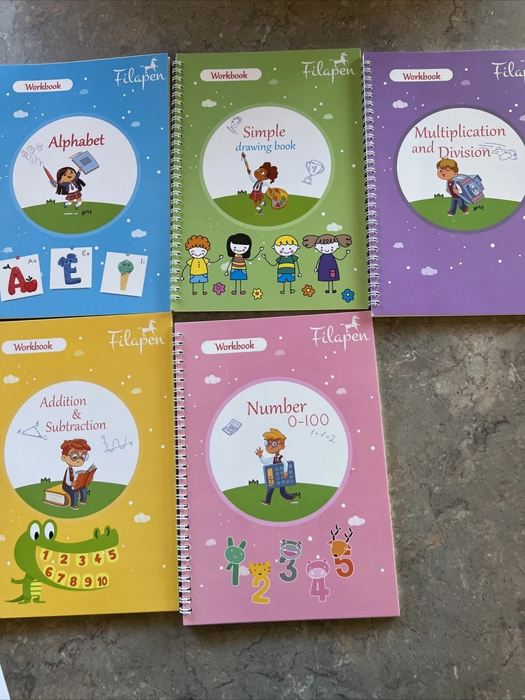 My Magical Books 5 Activity Books Set With pen and Ink By Filapen Numbers/ alphabet / drawing / addition Subtraction/ multiplication and division See pictures Box may come with few minor stains but books inside are new Pet smoke free home