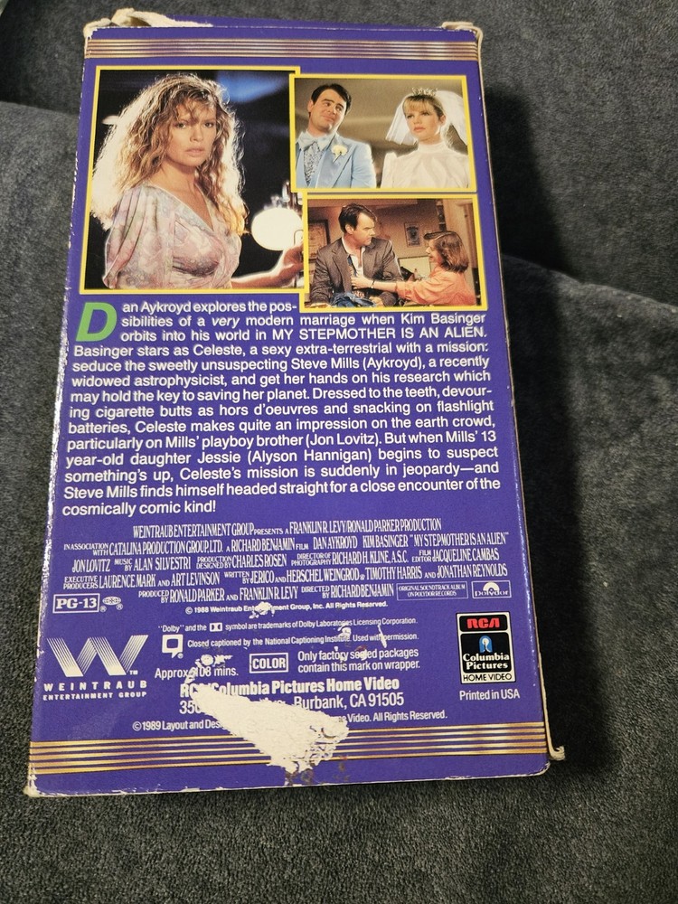 The product is a rare original release version of the 1988 VHS tape "My Stepmother Is An Alien." Directed by unknown, starring Dan Aykroyd, and produced by Columbia Pictures, this sci-fi comedy film is in NTSC signal standard with a PG-13 rating. It is a cult classic with special features and is in English language. The VHS tape is a sought-after collectible for fans of the unique and entertaining storyline of this movie.