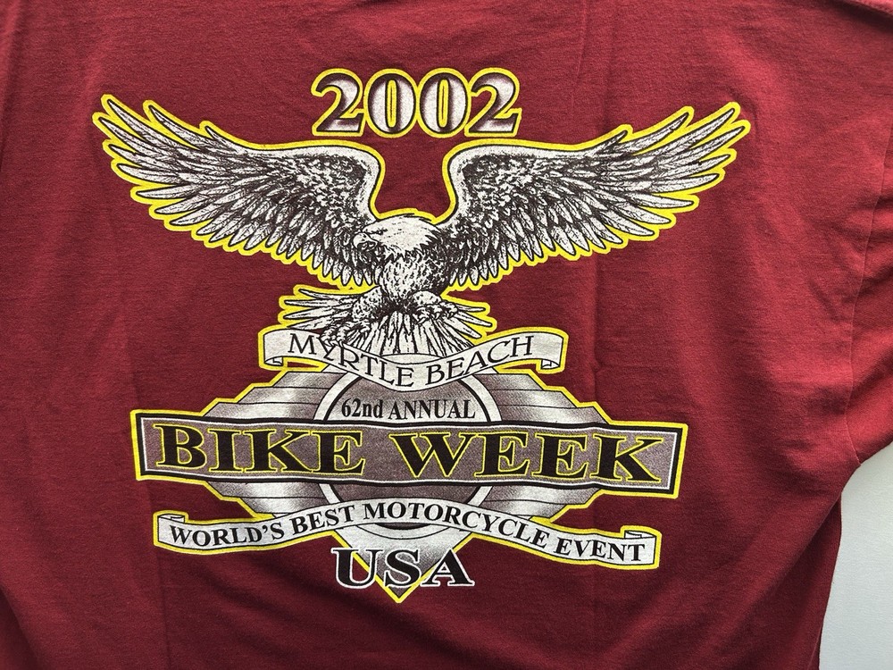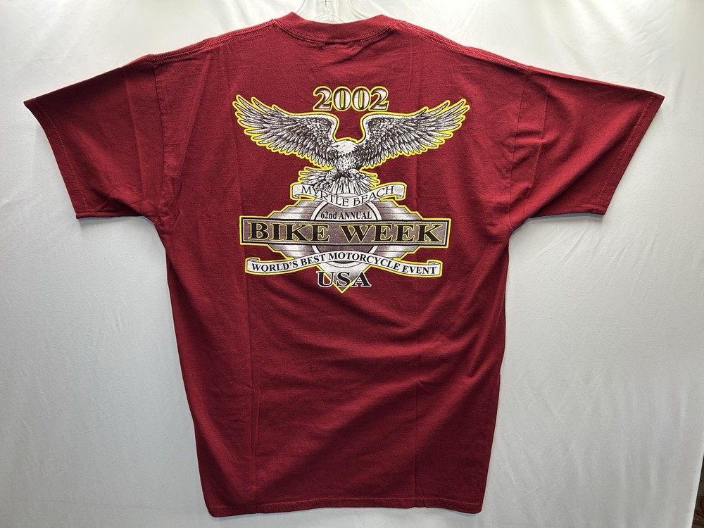 The Myrtle Beach Spring Rally 2002 y2k Vintage Bikers Tradition eagle cycle t-shirt by All Sport International is a stylish and nostalgic piece perfect for any biker enthusiast. This regular-sized shirt in burgundy features a biker theme, making it a unique addition to any wardrobe. The vintage design and colour give it a classic look that captures the spirit of the spring season rally. Show off your love for the open road with this eye-catching t-shirt.