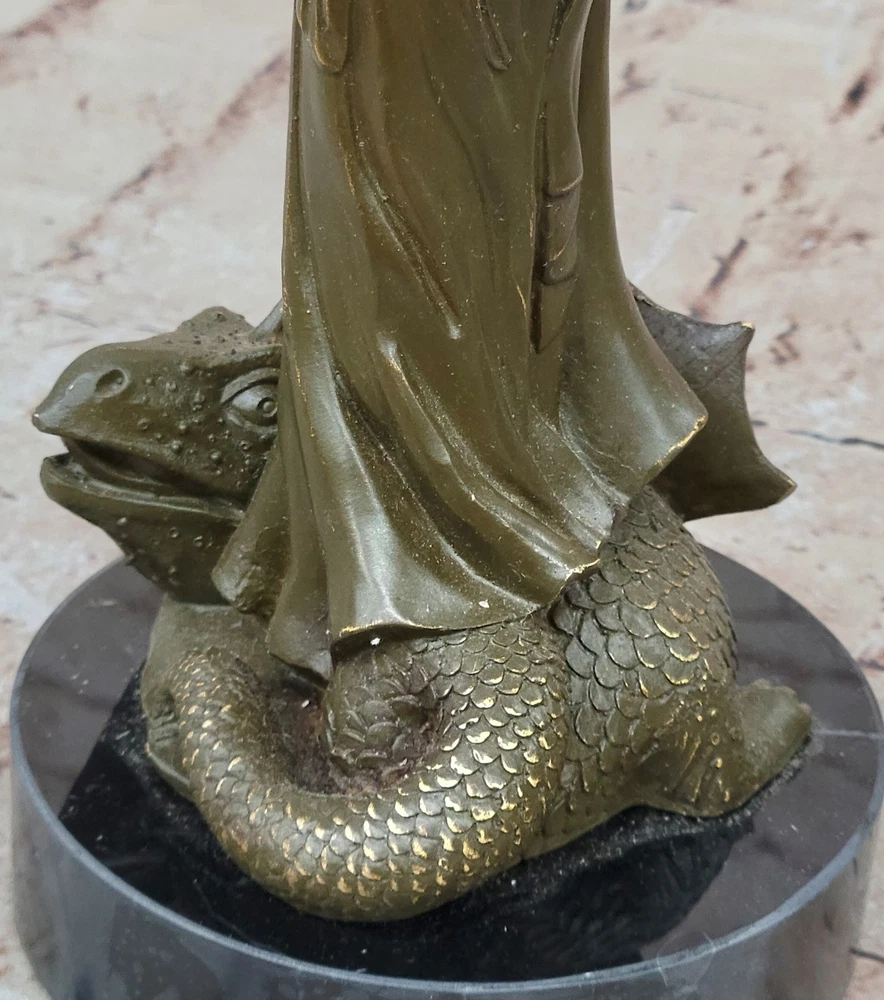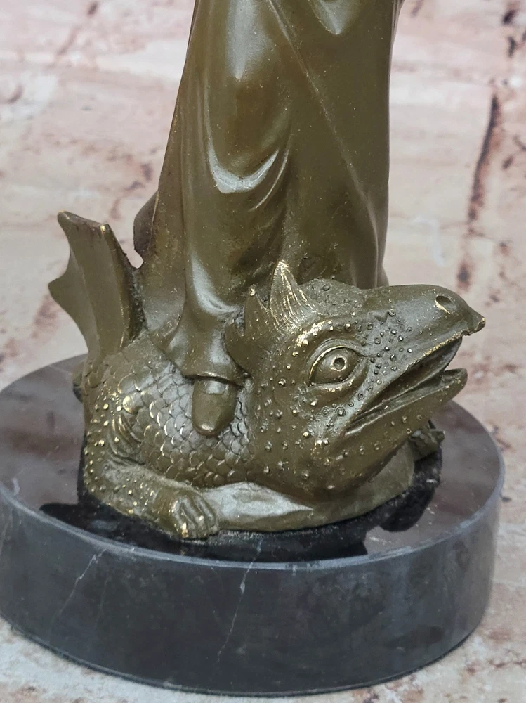 Mythical Athena Bronze Sculpture Statue Standing on Dragon Hand Made Artwork Mythical Athena Bronze Sculpture Statue Standing on Dragon Hand Made Artwork Condition : This sculpture is in perfect condition Bronze Dimensions with Marble Base: Height 10.5" X Width 4.5" Marble Dimensions: Diameter 4.5" Height without base:9.5" Weight:5 LBS Inventory:79GTS0525197 This striking bronze sculpture signed by A. Moreau depicts Athena, the revered Greek goddess of wisdom, war, and strategy, standing triumphantly atop a subdued dragon. Her commanding presence and poised stance reflect divine authority and unshakable confidence. With flowing garments and a focused gaze, Athena is portrayed in classical style, symbolizing strength and intellect prevailing over chaos and beastly forces. Handcrafted using the traditional lost wax casting method, this sculpture is hot cast in genuine bronze and finished with a rich brown patina that accentuates every intricate detail—from the goddess’s armor and robes to the textured scales of the dragon beneath her feet. The craftsmanship honors the mythological heritage while showcasing the artist’s mastery in bringing dynamic scenes to life in bronze. Mounted on a round black marble base, the sculpture exudes elegance and stability, making it a compelling centerpiece in any home, office, or gallery. A powerful tribute to Greek mythology and classical art, this signed work by A. Moreau is both a collectible treasure and an inspiring symbol of wisdom triumphing over adversity. Shipping Terms : Most of our items are shipped via USPS (United States Postal Service) mail or UPS. Most orders are shipped within 24-48 hours of purchase. Please be aware that not all items are available for USPS shipping due to size and weight. We do ship to Hawaii, Alaska, Canada, Puerto Rico, APO/AE, and U.S. Virgin Islands, however, an additional charge may be required. Please contact us before making any purchases in these areas. For Non-USA customers, you may be responsible for all duty, tax, brokerage fees that may be due upon delivery (shipping costs cover freight charges only). We also ship internationally. Please refer to the "Shipping and Handling" chart for the rates for each area. Payment : We accept just about any form of payment. PayPal, Master Card, Visa or American Express credit cards. Money orders, cashiers checks, and even personal or business checks. For governmental institutions, we will also accept a purchase order. Please understand that for personal or business checks we have to wait for the check to clear (usually 7 days) before shipping. Condition : New Detailed Hand Crafted Hot Cast Bronze Satisfaction Guaranteed. This is Stock Photo, Slight Color Variation!! Listing and template services provided by inkFrog