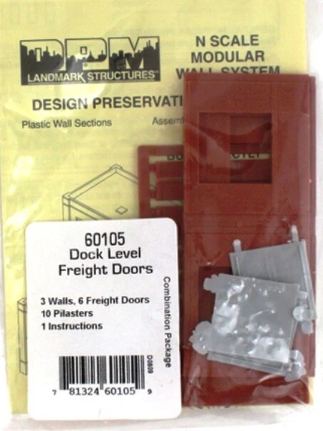 DPM-60105 3 Dock Level Wall w/Freight Doors "Modular system Building Kit" The N scale plastic modular system offers unlimited building options. Interchangeable wall sections make it easy to build a structure of any size, shape and height. Assemble with plastic model cement or solvent. Includes: 3 Walls 6 Freight Doors 10 Pilasters Instructions Measures 3-3/8" Wide x 1-13/32" High This kit is not painted! You are Buying Only what is listed! Comes New in Factory Package! Manufacturer: Design Preservation Models Sign up for my email newsletters by adding my E-Bay Store to your Favorites Check out more items in my store! Papa's Train Depot