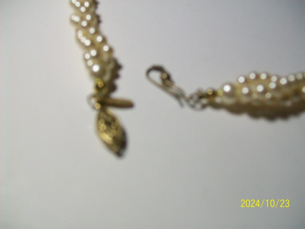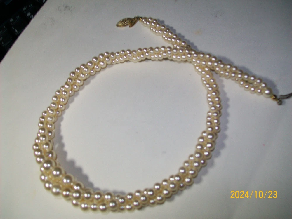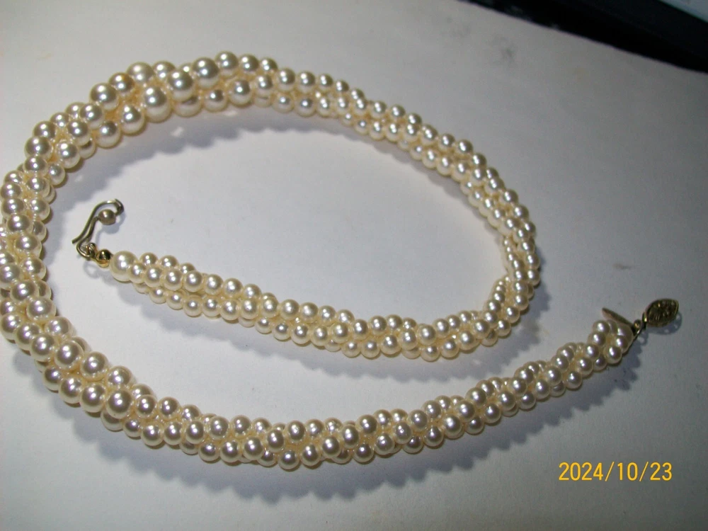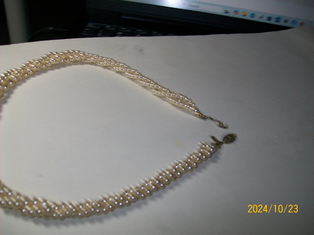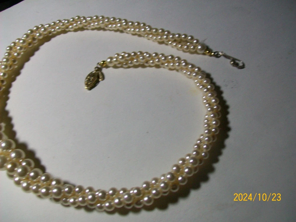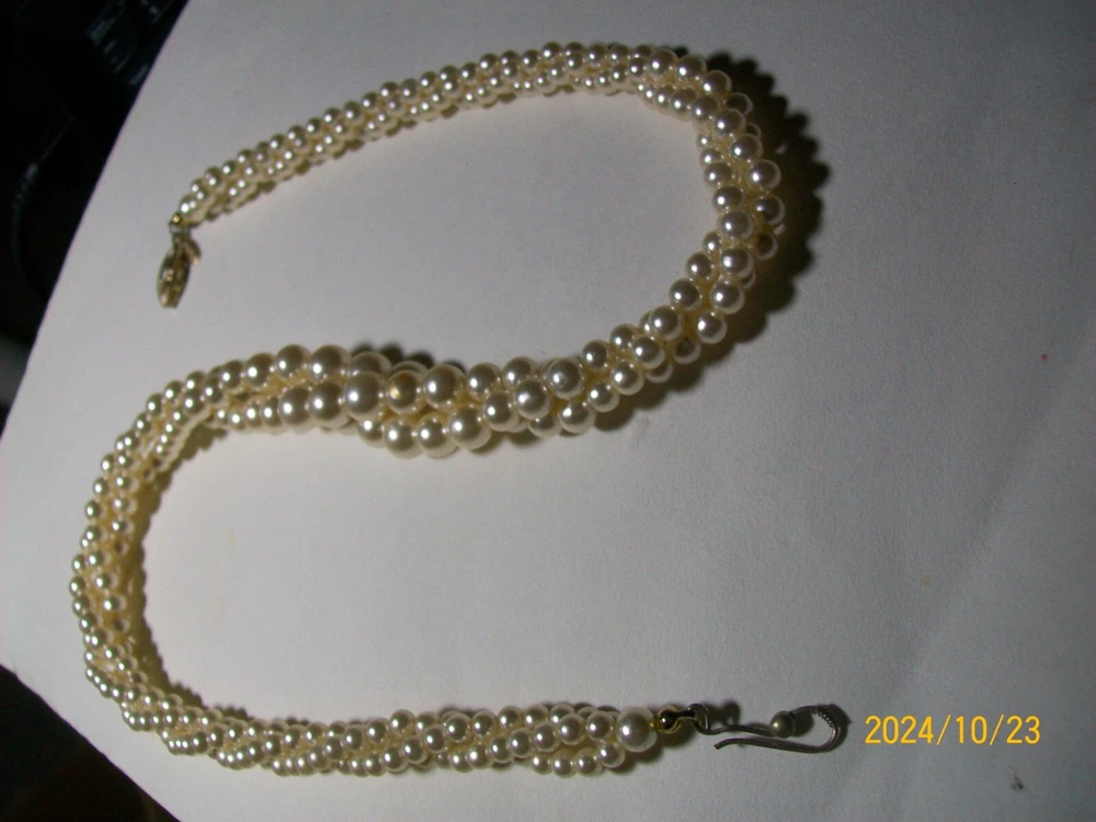 3-strand Faux PEARL Choker 17-1/2 Necklace, 1980s. No damage. Check neck size before ordering; one advertising similar to this says "collar" (don't think so unless mighty small neck. Estate sale. Please keep looking at "brumart66 "listings. Thank you.