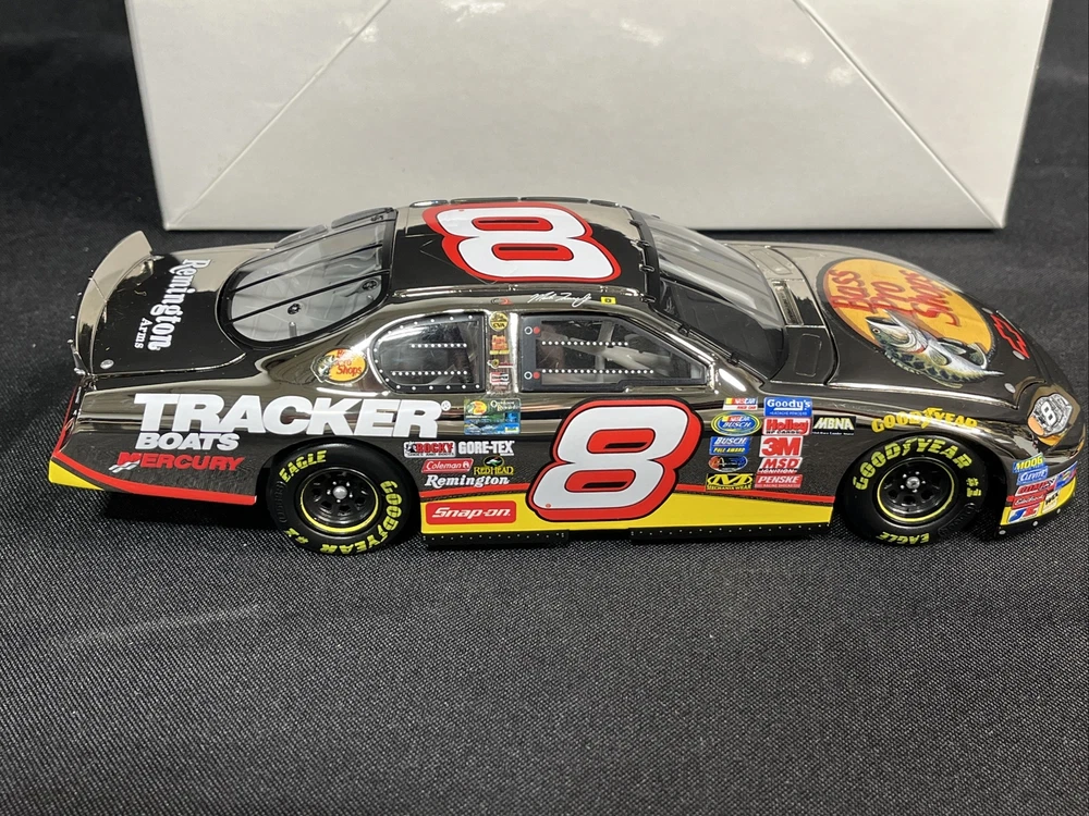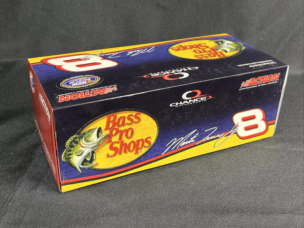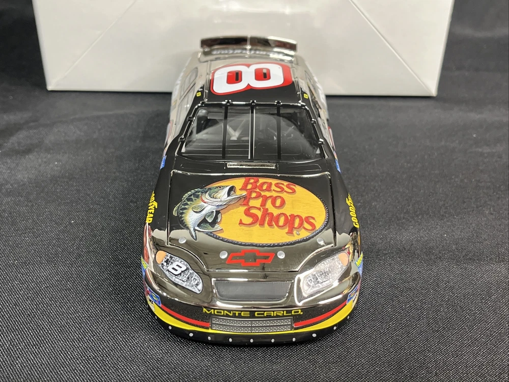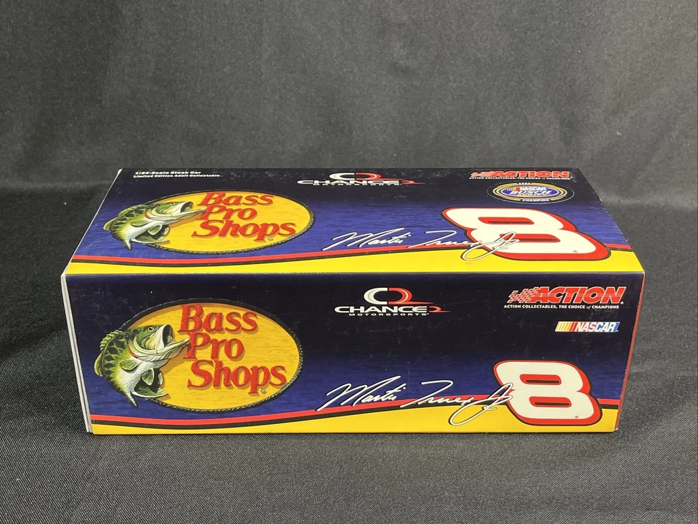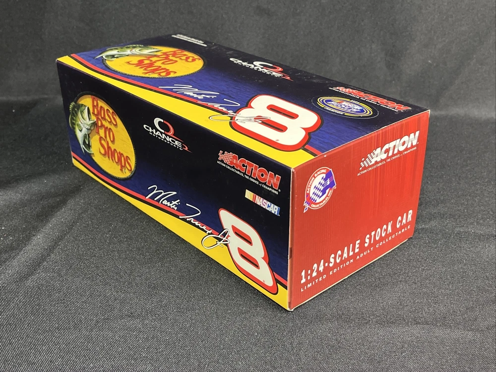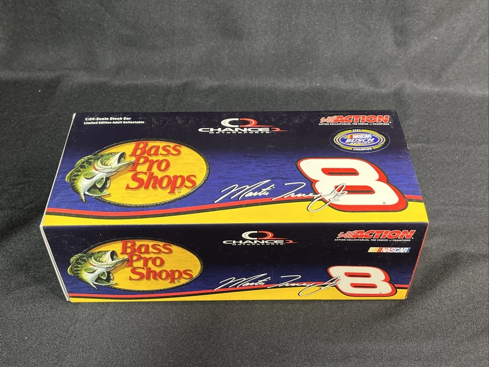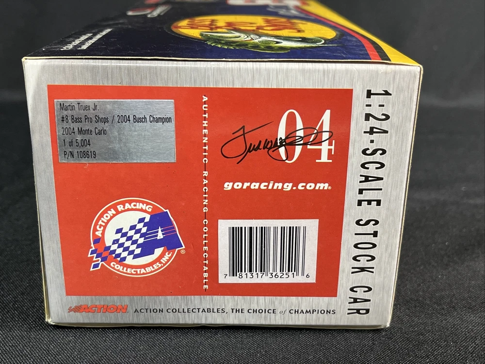 This diecast car is a 1:24 scale model of a 2004 Chevrolet Monte Carlo driven by Martin Truex Jr. in the NASCAR Busch Series. It features a Color Chrome finish and is part of the ARC series. The car is branded with Action and sponsored by Bass Pro Shops. It is not autographed and belongs to the Chance 2 racing team. Packaging may show signs of minor wear. SB