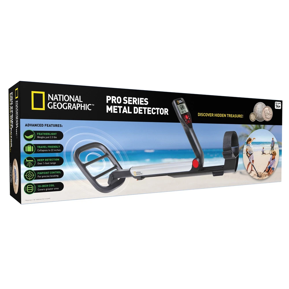 Become a treasure hunter! This professional metal detector is easy to use and fully adjustable. It’s light enough for the kids to operate but built with the advanced technology and powerful searching features desired by the pros. Take it to the beach, park, or on a hike and find treasure everywhere you go! This telescoping design makes this detector so portable you’ll never want to leave it at home. Features: • High-quality performance & simple operation • Highly portable telescoping design – no assembly required • 10” waterproof detection coil • Audio alert detection with volume adjustment and headphone jack • 3 detection modes to filter out “garbage” metals • 4 sensitivity modes to detect treasure as deep as 12 inches underground • Pinpoint function for added precision • Easy to understand LCD display This is a quality gift for any boy or girl and will provide years of excitement. Get your PRO Series Metal Detector today and discover the wonders hidden right below your feet. National Geographic Toys is proud to provide a 100% satisfaction guarantee with all our products so that you can buy with confidence. About the National Geographic Society With a mission to inspire people to care about the planet, the 126-year-old National Geographic Society is one of the world’s largest nonprofit scientific and educational organizations. National Geographic’s net proceeds support vital exploration, conservation, research, and education programs. FIND BURIED TREASURE - Feel the thrill of discovery when you locate cool treasure like gold, coins, jewelry, and more with the advanced technology and powerful searching features of this Pro Detector. A fun outdoor gift for any treasure hunter! EASY TO USE – Fully adjustable and lightweight with an easy to understand LCD display make the Pro Detector accessible for all ages, sizes, and skill levels from beginner to advanced. Just unfold and go! GREAT FOR TRAVEL – Portable yet powerful! The large, waterproof, 10-inch coil is lightweight, and the collapsible design makes it easy to transport. Use it in your yard, bring it to the beach, or any of your favorite treasure hunting spots! PACKED WITH PROFESSIONAL FEATURES – Detect treasure as deep as 12 inches with 4 sensitivity levels, while filtering out “garbage metals” with the 3 detection modes. Use the pinpoint feature for added precision and to help you distinguish trash from treasure. HIGH-QUALITY EDUCATIONAL TOYS - We're proud to make the highest quality hands-on science toys, and all our products are backed by exceptional service. If your experience is less than stellar, let us know and we'll make things right!