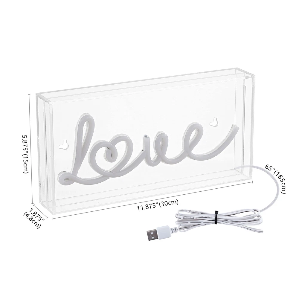 Bright neon makes a whimsical addition to your bookshelf or gallery wall. Place our hearted Love sign in your bedroom to tune up the romantic ambiance. Convenient, low-voltage USB power is perfect for a bedroom or dorm room. STYLISH & PRACTICAL DESIGN: Neon Lights are designed with quality care; Let everyone know your selected message that's glazing in your dimly lit space, whether it's to invite them in or instigate lively vibes EASY TO INSTALL: Integrated USB cable, this neon light can be inserted into a USB port; This neon light has options for installing - it can be placed on any level of flat surface or hung on a wall; Pre-made holes allow easy inserts for wall mounting SATISFACTION GUARANTEED: Every design is created with uncompromising attention to detail, using only the highest quality components; Based in Soho, New York, designer Jonathan and his talented team create affordable high-end home decor Acrylic box frame has nail slots for hanging; plus it stands by itself on a shelf or table Includes cable for safe, energy-efficient USB power - use a wall outlet or battery pack