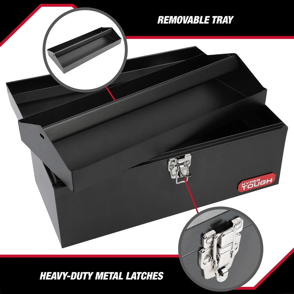 This Hyper Tough 16-Inch Black Metal Toolbox with Removable Tray (model 3482V) allows for convenient storage and portability of your tools. The tool box has many high quality features like a lockable metal latch and removable metal tray. The unit is made from heavy gauge steel with a hinge that runs the full length of the box and is finished with powder coat paint for long lasting use and durability. This tool box provides convenient storage and organization of your most commonly used tools. 16-Inch Metal Tool Box with Removable Tool Tray, Black 16-inch Metal Tool Box: Allows for convenient storage and portability of tools Metal Latch: Firm latch will securely hold all your tools Removable metal tray: Allows for easy organization Full length hinge Powder coated paint: Long lasting and durable Constructed of long lasting, durable materials Color: Black On Jan 7, 2025 at 05:01:20 PST, seller added the following information: