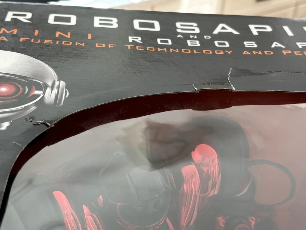 Vintage 2005 WowWee Robonetics Robosapien & Mini Combo Set This is a rare, limited-edition Metallic Red Chrome collector's set featuring both the original 14-inch Robosapien and its 7-inch Mini counterpart. A perfect "fusion of technology and personality" from the golden age of consumer robotics. Key Features: Full-Size Robosapien (14"): Fully programmable with 67 functions including walking, dancing, and "karate" moves. Features fluid biomorphic motion. Mini Robosapien (7"): Battery-operated walking action with light-up eyes and poseable arms. Rare Finish: Highly reflective metallic red chrome—much harder to find than the standard white/black versions. What's Included: Full-size Robot, Mini Robot, Remote Control, and Original Packaging. Condition Note: New in box. Minor shelf wear some small tears see photos. Remains factory sealed. Please see high-resolution photos for exact details.