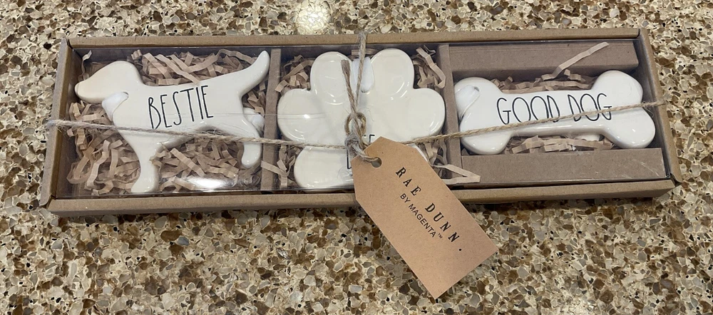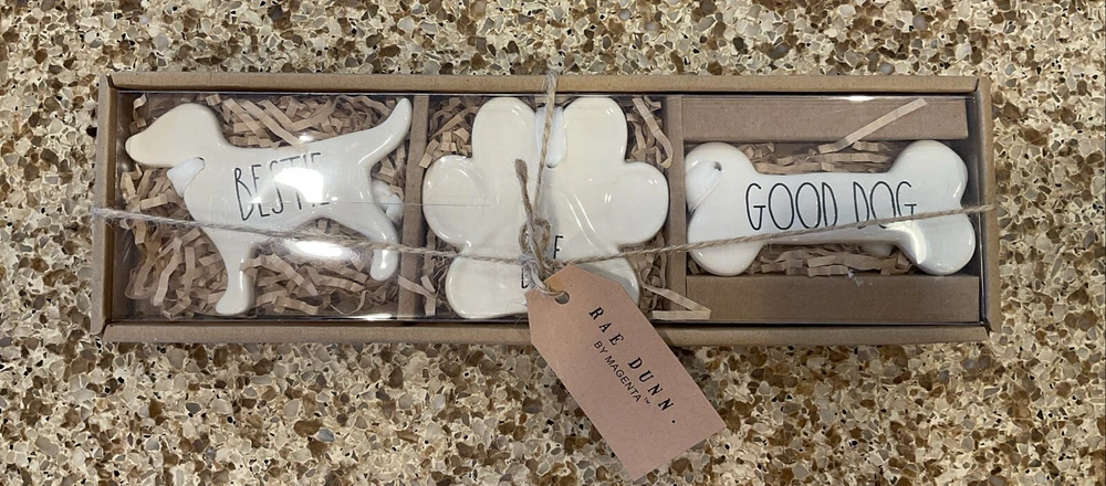 This Rae Dunn ornaments are the perfect addition to any dog lover's collection. The ornaments features cute and playful designs with a dog-shaped body, a paw and dog bone! They are made of high-quality materials to ensure durability and longevity, so you can enjoy it for years to come. The ornaments are ideal for decorating your home or office, and it makes a great gift for anyone who loves dogs. Whether you're a collector or just looking for a unique decorative piece, this Rae Dunn ornament is sure to add a touch of whimsy to any space. The ornaments are about 4 inches in length, RAE DUNN MAGENTA.