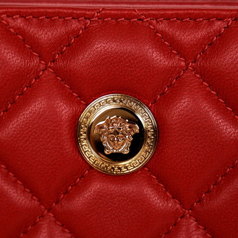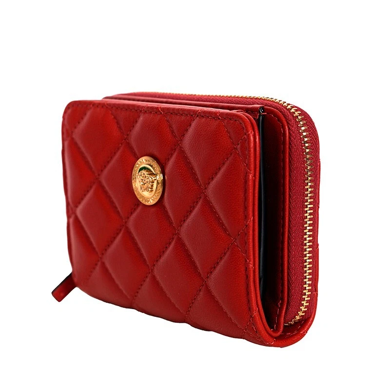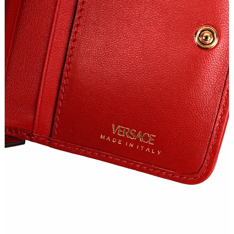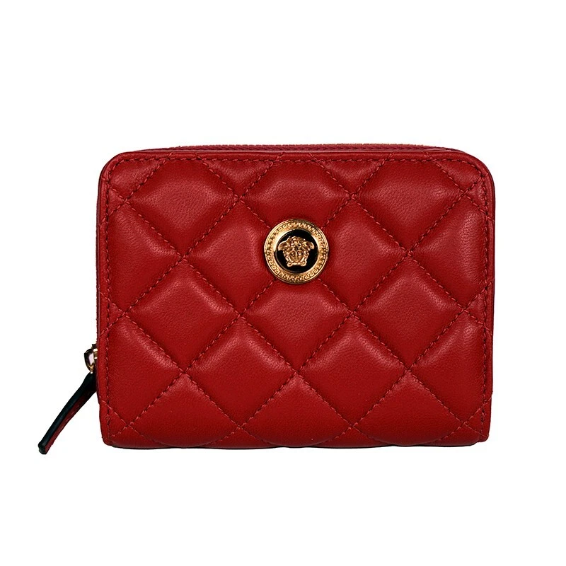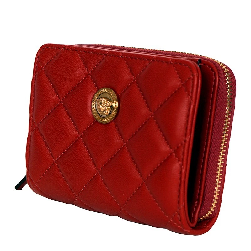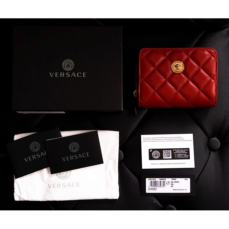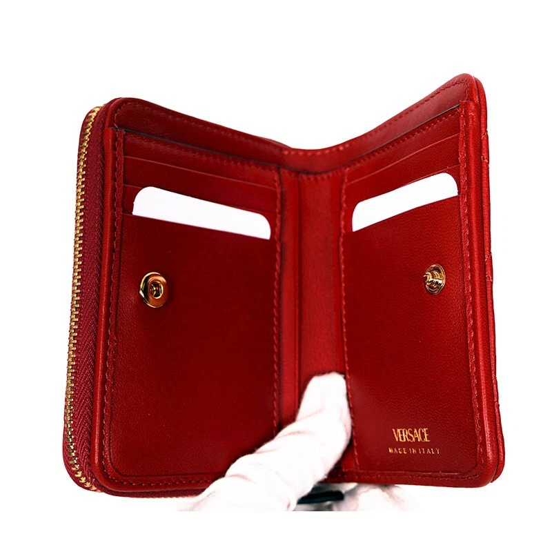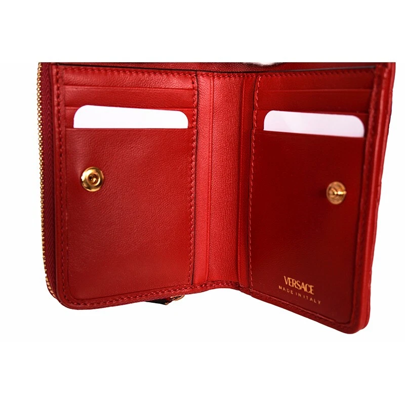 HTML 5 Template NEW $625 VERSACE Red Leather Quilted Gold Medusa Zip Top Bi-Fold Snap Wallet Size(s) Height: 4" Width: 4.75" Depth: 1.5" Description New with box, dustbag and tag. Purchased from Versace. Retail $625. Photos are of the actual wallet. Authentic Versace wallet in a vivid color. All red in quilted leather. Gold-tone hardware. Medusa head logo embellishment on front. Bi-fold with snap closure. Cash slot and six credit card slots. Zip around compartment. Lined in canvas. Style DP8G507. Made in Italy. Use it many thing, hold receipts, change, business cards. Very cute. * All items are clean and from a non-smoking home. * ** Payment is expected within 5 days. Please read measurement carefully as sizes vary with designers, please ask for additional measurements if you are unsure. No refunds but exchange is permitted. Items are described as accurately as possible. In cases where refunds are sent the original shipping will not be refunded. All items are AUTHENTIC. Please ask all questions before purchasing. Thank you! **