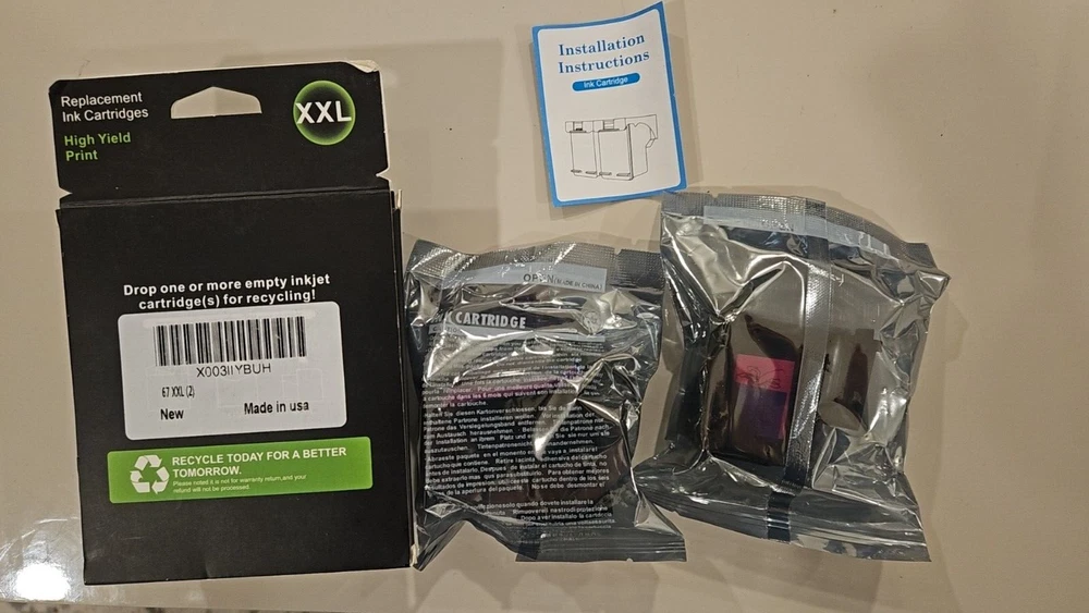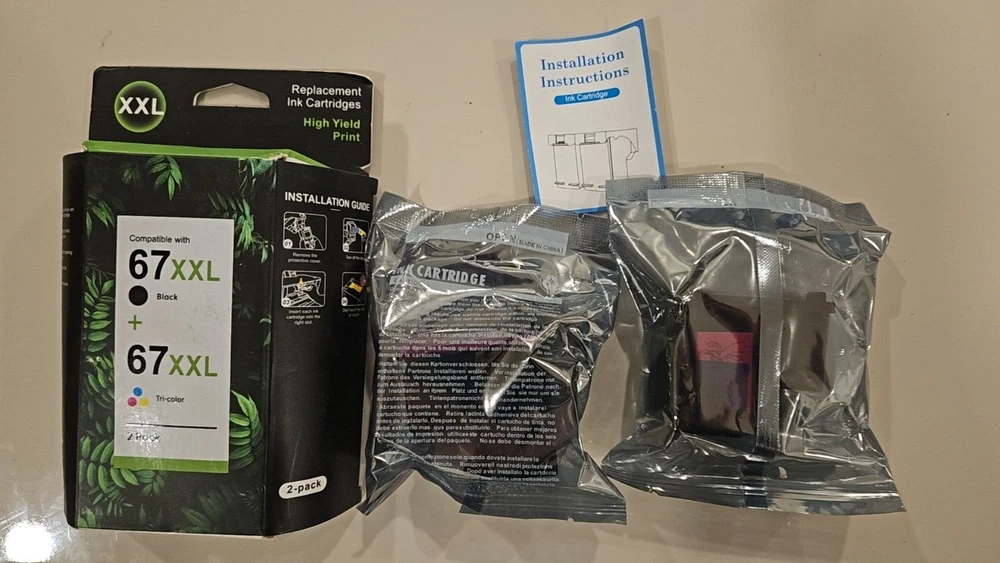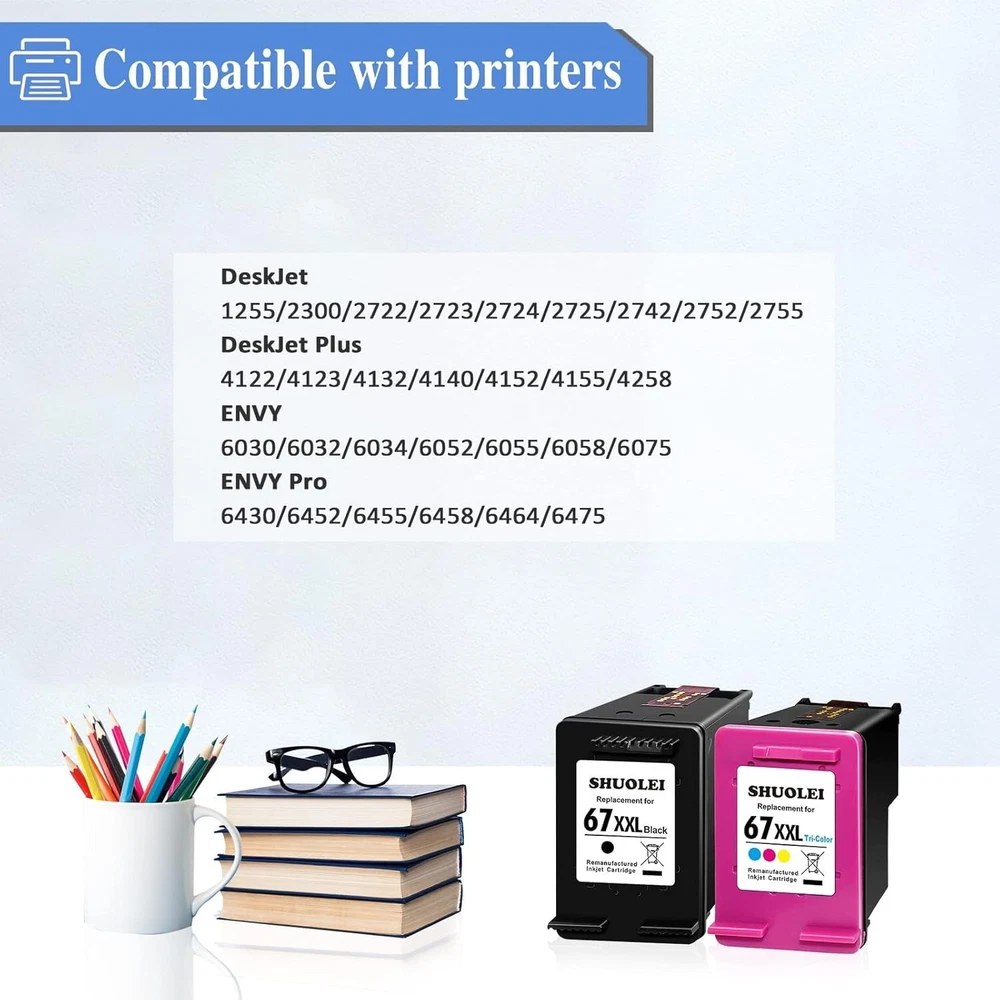 67XL Black/Color Ink Cartridges (2 Pack) Replacement for HP DeskJet 2855e 4255e 4155 2755e 4110e 2720e 2722 for HP Envy 6055e 6458e 6010e 6020e for HP Envy Pro 6455e 6475 Printer High-Yield Inkjet About this item 【Compatible with Printers】 Compatible with HP DeskJet 1255/2300/2722/2723/2724/2725/2742/2752/2755, For DeskJet Plus 4122/4123/4132/4140/4152/4155/4258, for Envy 6030/6032/6034/6052/6055/6058/6075, for Envy Pro 6430/6452/6455/6458/6464/6475 Printers. 【Package Contents】 Total 2 Packs of Remanufactured 67XXL 67XL Ink Cartridges Black & Color Combo Pack (1 x 67XXL Black , 1 x 67XXL Tri-Color ). (NOT ORIGINAL). 【High Page Yield】 67XXL 67XL ink combo pack offering Up to 650 pages per 67XXL black ink cartridges, and 450 pages per 67XXL Tri-Color cartridges compatible with hp deskjet 2700 ink cartridges (with 5% coverage of A4 paper). 【High Performance】 67XXL ink cartridges equipped with latest Intelligent chip ensure 100% compatible with your printers. We provide the high printing effect for users , sharp and clear texts, vivid and natural color work with HP Envy 6000 ink cartridges.