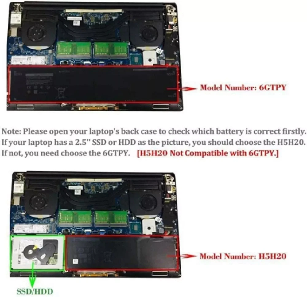 Item Description: Voltage: 11.4V Capacity: 97Wh Cells: 6-Cell Battery Type: Li-ion Condition: Brand New Warranty: 60 Days money return and 12 months warranty Compatible Part Numbers: 6GTPY 5041C 05041C 5D91C 5XJ28 GPM03 Compatible Laptop Models : For Dell XPS 15 9560 Series: Dell XPS 15 2017 9560; XPS 15-9560-D1745; XPS 15-9560-D1845T; XPS 15-9560-D1645. Dell XPS 15-9560-D1545; XPS 15-9560-D1845; XPS 15 9560 i7-7700HQ. For Dell XPS 15 9570 Series: Dell XPS 15-9570 ; XPS 15 2018 9570; XPS 15-9570-D1541; XPS 15-9570-D1945T. Dell XPS 15-9570-D1841; XPS 15-9570-D1845; XPS 15-9570-D1501; XPS 15-9570-D1741. Dell XPS 15-9570-D1605; XPS 15 9570 i7 UHD; XPS 15-9570-D1941T. For Dell XPS 15 7590 Series For Dell Vostro 7500 Series For Dell Precision 5520 (M5520 Workstation) Series For Dell Precision 5530 (M5530 Xeon E-2176M Workstation) Series For Dell Precision 5540 (M5540 Workstation) Series For Dell Precision 5510 (M5510 Workstation) Series NOTE : Dell Precision 5510 laptop has Two Batteries: 6GTPY and H5H20 , recommend that you open the back cover of your notebook before purchasing to determine the exact battery model, 6GTPY is long than H5H20 beacouse of the SDD .If your laptop don't have ssd/HDD you should buy 6GTPY battery. If have a ssd/HDD, You should buy H5H20. Kindly note: Not all the compatible laptop models have been listed, please open the back case of your laptop and choose the right battery model according to your laptop's original battery. 1. First check if the battery is the same size as your original battery after receiving it. When installing the battery, pay attention to whether the battery cable is fixed. If the battery cable is not installed correctly, the battery may not be charged. 2. If you use the battery for the first time after installing the battery, please do not charge the battery immediately, first use the battery to 10-20%, and then charge the battery, and cycle charging 5-6 times to activate the maximum use of the battery space. 3. We recommend that you search for battery removal tutorials on the Internet in advance, or seek help from a professional technician. We won't responsible for any damage due to improper operation. Laptop Battery Return Policy: Rest assured with 30 days Refund and 12 months Replacement,also get our friendly customer service.