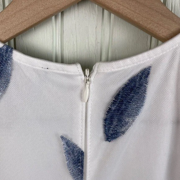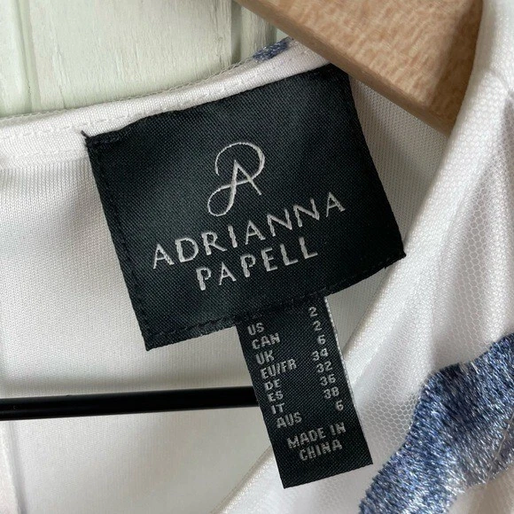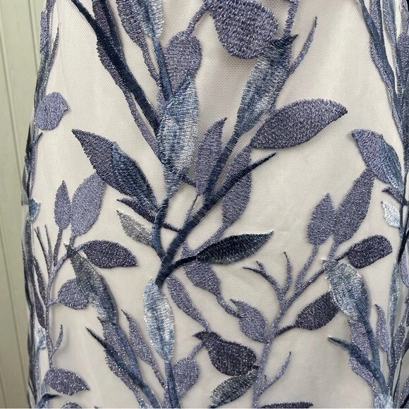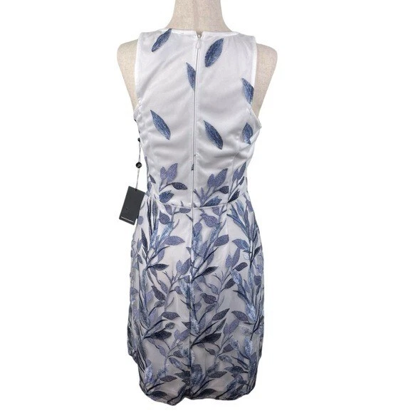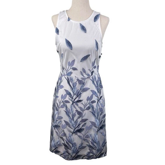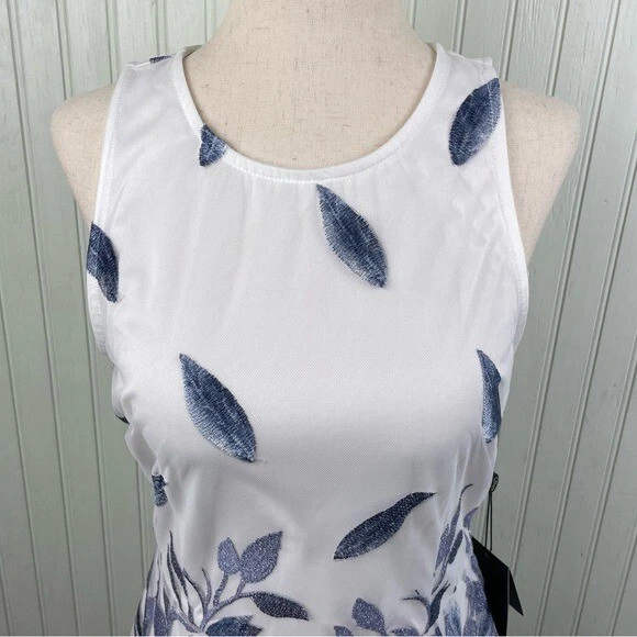 Adrianna Papell Leaf-Embroidered A-Line Dress in Blue Multi A simple, chic dress, beautifully printed and embroidered in a leaf pattern and delicate piping at the waist and a touch of metallic threading for added shine. A streamlined silhouette is fitted through the hips and is eased with a slight A-line hem. Sleek back zip closure. Fabric Content: 100% Polyester Lining: 100% Polyester Care Instructions: Dry Clean US Size 2 Shown on a size 2-4 mannequin Brand new with tags! Approximate measurements: Pit to pit: 16” Waist: 13.5” across Length from shoulder: 36”