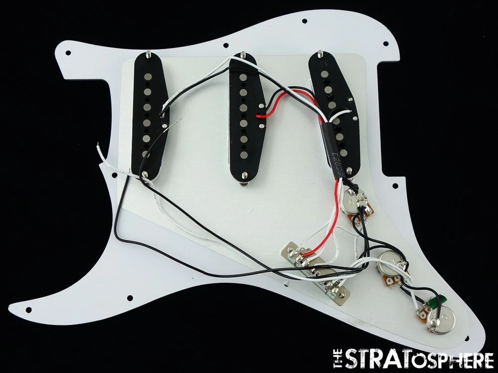 Description: Loaded Pickguard for Stratocaster complete with Alnico 5 Pickups (Output: Neck 6.0K 4.0H, Middle 6.0K 4.0H, Bridge 6.4K 4.5H; Staggered Alnico 5 magnets), 250K Pots, 5 Way Switch and Knobs Condition: New Type: Loaded Pickguard (Black Rose, 11 Hole for Fender American & Mexican Standard) Comments: This great sounding prewired pickguard features just the right amount of output, a tight low end, slightly scooped mids and defined treble. It delivers beautiful clean tones and loves to be pushed into sweet overdrive- maintains great clarity without getting harsh. We have had this line manufactured in great volume in order to provide you the best value on the market for alnico magnet designed pickups. Get yours today!