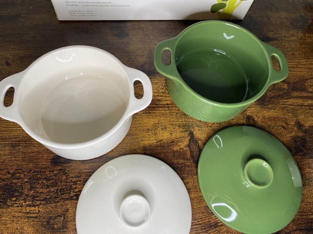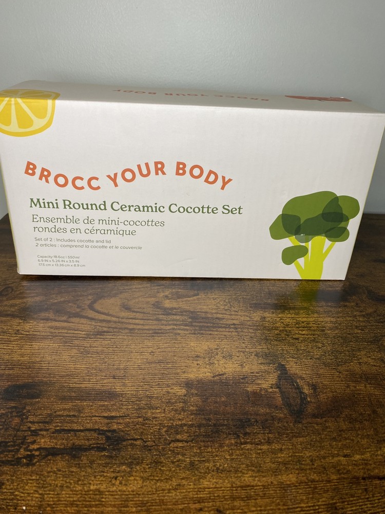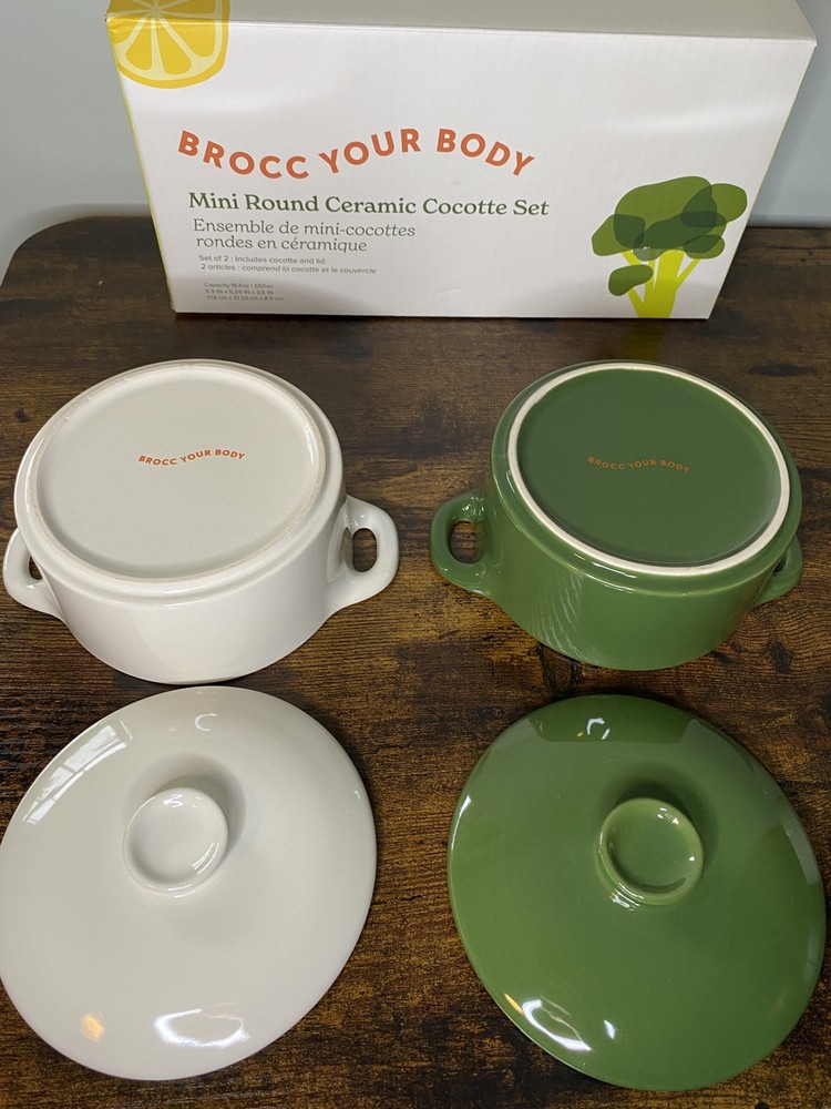 The NEW BROCC YOUR BODY Mini Round Ceramic Cocotte Dutch Oven Set includes two mini dutch ovens with handles and lids. These set of cocottes are oven and microwave safe, made of ceramic material, and have a capacity of 18.6 oz each. They are designed with a round shape, white and green color, and come with features such as double handles, flat-bottomed design, and are dishwasher safe. With a heat resistance of up to 475 F, these mini cocottes are suitable for use in electric, gas, and microwave ovens, making them a versatile addition to any kitchen.