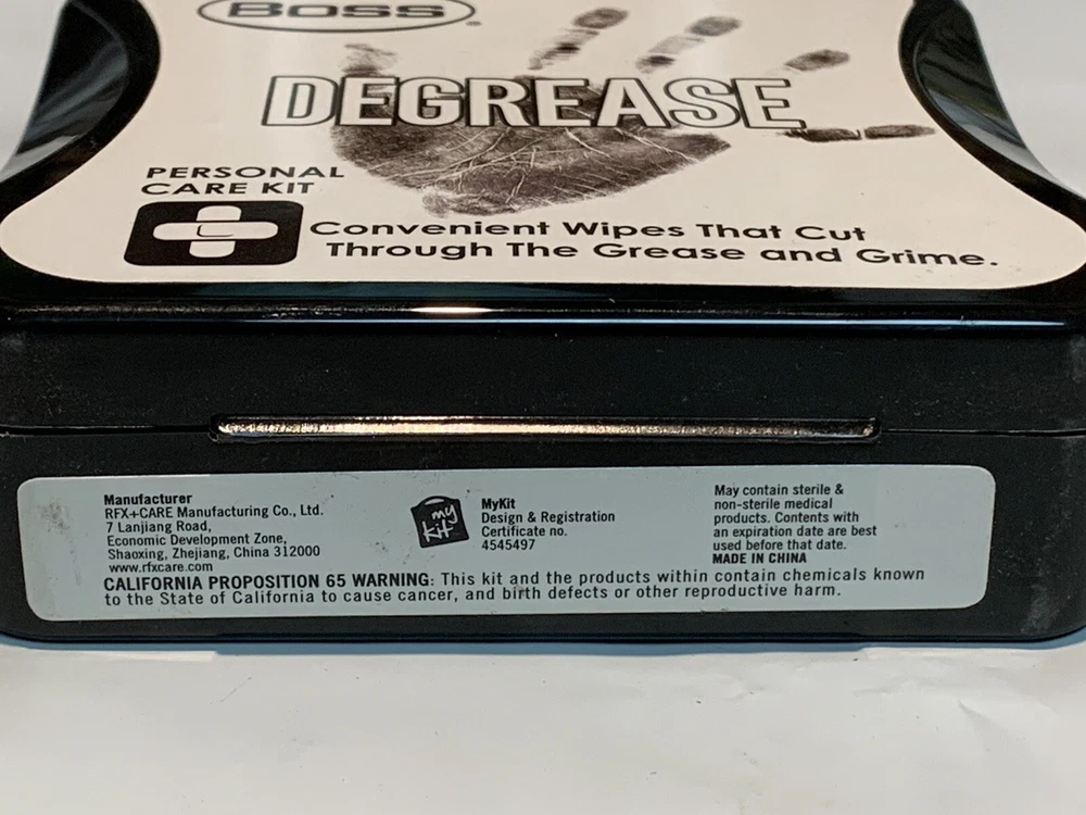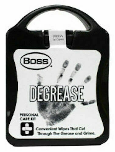 New & Factory Sealed with Quick and Free Shipping NEW Boss Degrease PERSONAL CARE Kit - Removes grease and grime COMES IN A STURDY PLASTIC CASE FOR STORAGE IN CAR, BOAT, GARAGE... THIS KIT Includes: 4 degrease wipes 1 pair of disposable gloves MEASURES APPROX 4" X 5.25" Packed in a reusable semi-transparent black container FREE SHIPPING
