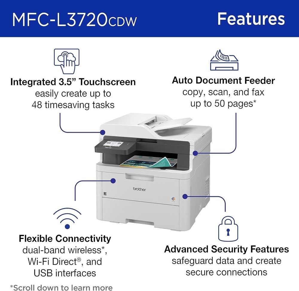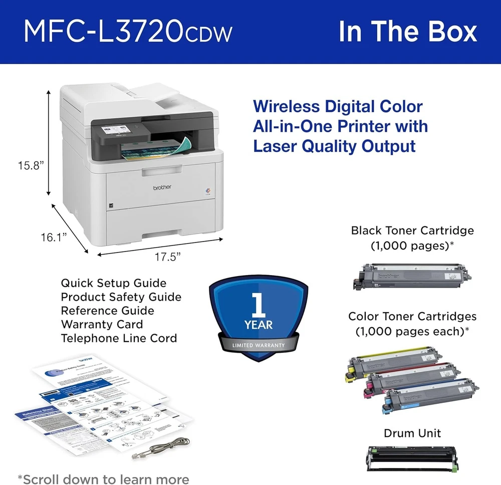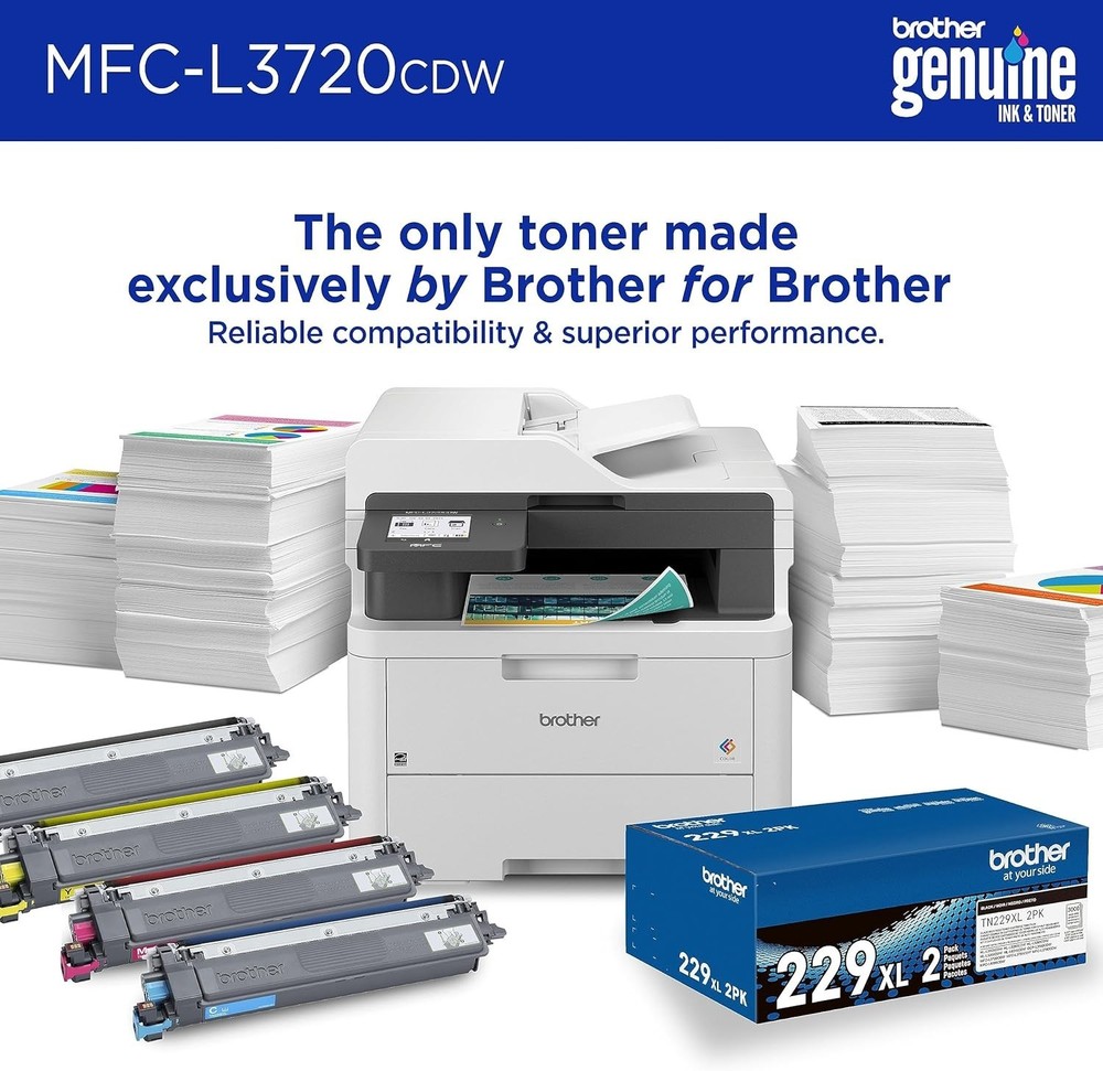 NEW! Brother MFC-L3720CDW Digital Color All-in-One Printer w/ Copy, Scan and Fax The Brother MFC-L3720CDW wireless all-in-one, digital color printer with copy, scan, and fax functionalities is always ready to meet the demands of your small office with fast and reliable operation. With a host of helpful features and functions, it consistently creates clear, smudge-free documents. With steadfast efficiency, it achieves print speeds of up to 19 pages per minute (ppm)‡ and scan speeds up to 29/22 images per minute (ipm) (black/color)‡. Versatile paper handling and connectivity options are designed to help you work smarter and save time. Intuitive and customizable, the 3.5” touchscreen simplifies tasks and connects you directly to a wide variety of Cloud-based apps‡. Advanced security features safeguard sensitive information and create secure connections to devices and networks. Engineered and supported by Brother, the MFC-L3720CDW is a trustworthy, hard-working addition to any small office or business. Main Features Upgrade your professional documents . With the consistent dependability of laser-quality digital color printing. Maximize efficiency. All-in-one functionality . Conveniently accomplishes four essential business tasks with consistent performance and reliable print speeds up to 19 ppm‡ and scan speeds up to 29/22 ipm (black/color)‡. Flexible connection options . Enables multiple users and devices to connect easily to the printer with built-in dual-band wireless (2.4GHz / 5GHz)‡ and Wi-Fi Direct® or connect locally to a single computer via USB 2.0 interface. Cloud connectivity . The easy-to-use 3.5” color touchscreen puts you in control and connects you to popular Cloud-based apps such as Google Drive™, Dropbox, Evernote, OneNote, and more‡ for dynamic scanning and printing. Versatile paper handling . Equipped to drive efficiency and increase productivity with a 250-sheet capacity paper tray that helps minimize the frequency of paper refills and adjusts for letter or legal size‡, plus a 50-page Auto Document Feeder‡ for timesaving multi-page copying, scanning, and faxing. Advanced security features . Safeguard sensitive documents and create secure connections to devices and networks for peace of mind printing. Print from virtually anywhere . Brother Mobile Connect app puts the power of printer management in your hands. Print remotely, scan to mobile app, monitor toner levels, and re-order supplies directly from Brother‡. Print with purpose . Engineered to be environmentally friendly, MFC-L3720CDW is ENERGY STAR® compliant and EPEAT® Silver rated. Eco-friendly printer features include Eco Mode, Toner Save Mode, and automatic duplex printing. Refresh EZ Print Subscription . With Refresh EZ Print Subscription smart ink & toner service, you’ll never worry about running out of toner again, plus you’ll enjoy savings up to 50% on Brother Genuine Toner‡. Get started today with a Free Trial‡. Vibrant and Crisp Prints with Brother Genuine . Made specifically for Brother printers, Brother Genuine Toner promises reliable compatibility and continually consistent performance with cost effective high-yield and multipack options. Replace with Brother Genuine Toner: TN229 Standard Yield, TN229XL High Yield, or TN229V Value High Yield. For any inquiries or issues, please feel free to contact our dedicated customer support team via the "Contact Seller" section. We are committed to providing you with the best possible service. We are always here to assist you! Note -We do not ship to warehouse addresses -We do not ship to island addresses -We do not ship to Po Box addresses