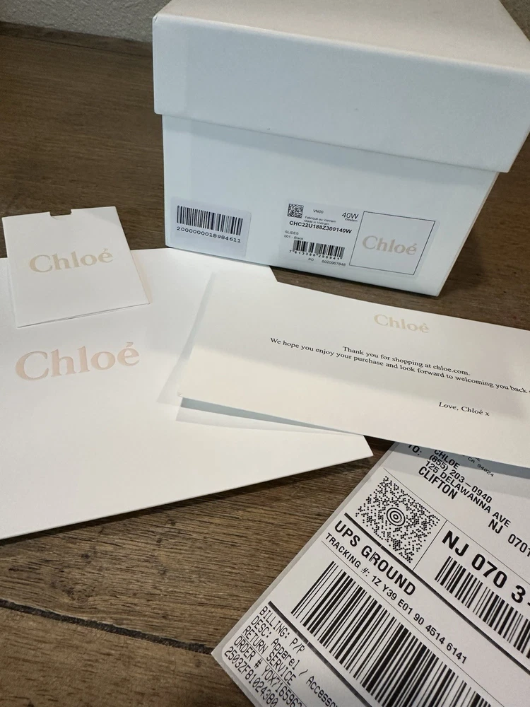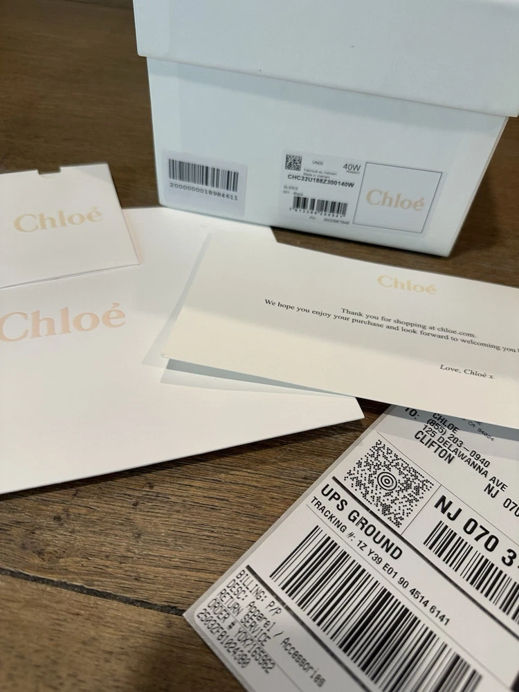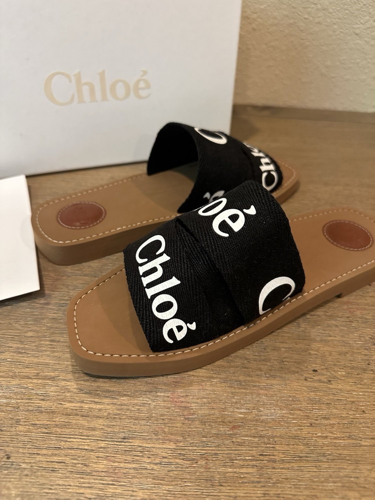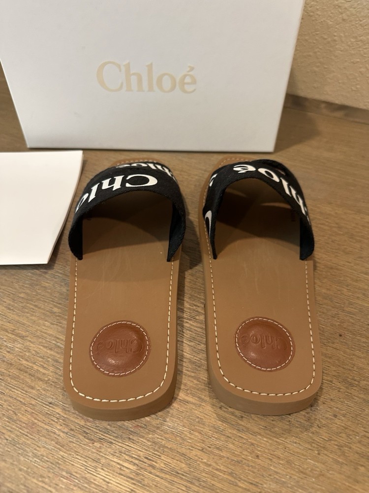 NEW - NEVER WORN - WOMENS CHLOE WOODY LOGO SLIDE SANDAL SIZE 40 BLACK & WHITE NEW with tags, box, receipt Size 40 Revisited in lower-impact linen, this Woody flat mule reveals an interplay of different-sized ribbons with the Chloé logo in striking contrast. Together, they form a large upper for a comfortable fit. The easy slip-on design makes this flat a summer essential. The Maison's "O" signature adorns the inner sole, while iconic ecru stitches lend an equestrian mood to the recycled rubber sole for a playful twist. Purchased from Chloe Direct - have receipts