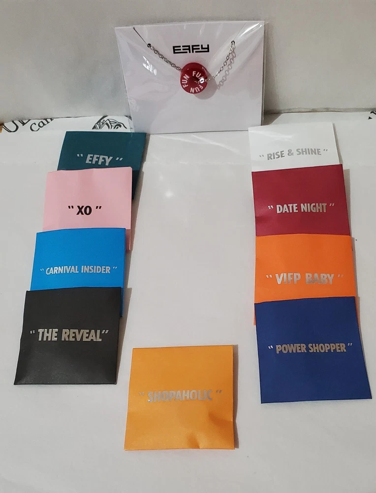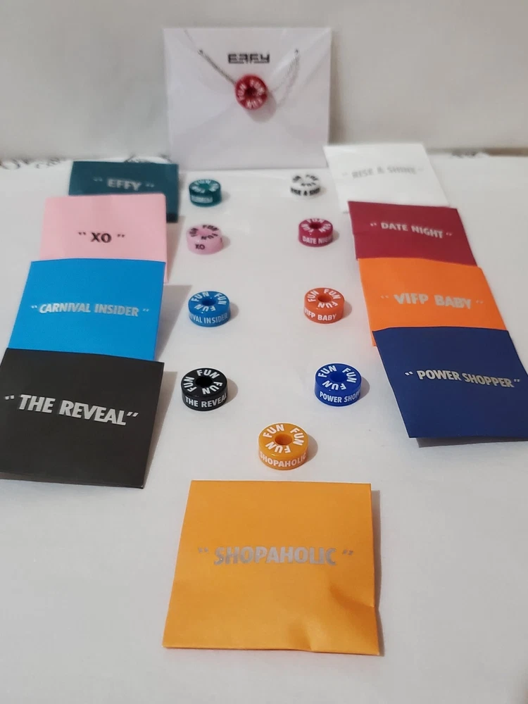 NEW Set of 10 Barrels CARNIVAL CRUISE COLLECTION EFFY JEWELRY 10 FUN FUN FUN BARRELS Each barrel represents a different shopping experience in the EFFY Funstore. The shopping theme is printed on the side of the barrel. All Barrels have WHITE LETTERING Except the White & Pink Barrel ~This Set includes the 2 newest barrels~ Carnival Insider "XO" The 10 BARRELS INCLUDE : Red with chain - Fun Ship White - Rise & Shine Raspberry - Date Night Orange - VIFP Baby Blue - Power Shopper Yellow - Shopaholic Black - The Reveal Light Blue - Carnival Insider Pink - XO Turquoise - Effy (see pictures) Pictures are my personal pictures showing the exact item you will receive ------------------------ Comes from a Smoke-Free/Pet-Free home Questions???Ask before bidding!