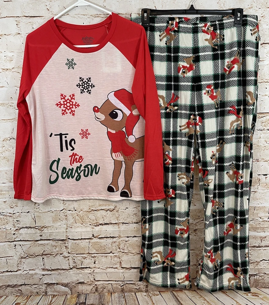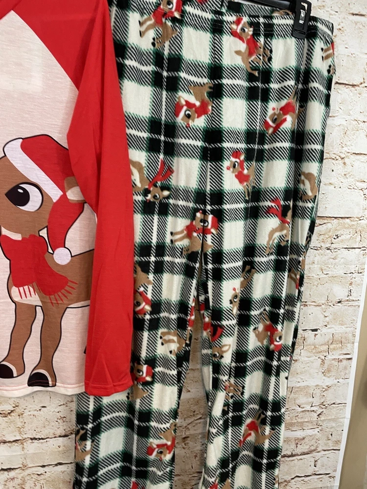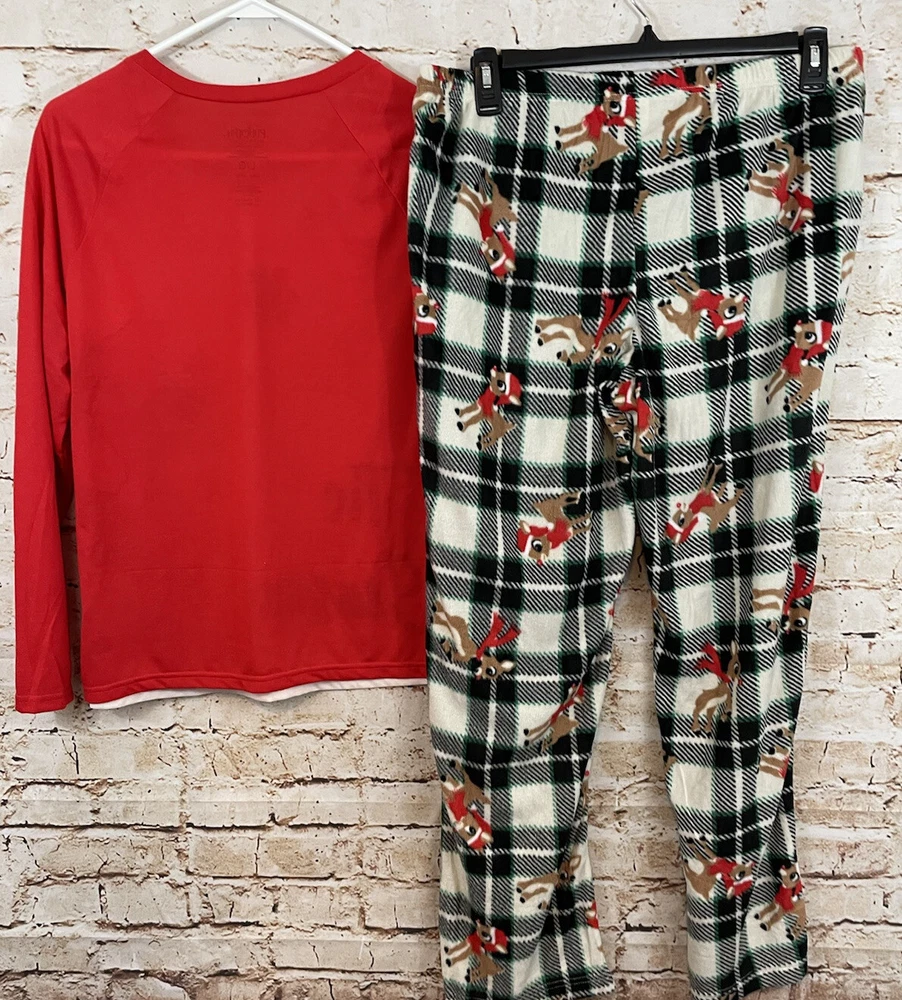 New with tags Jammies for Your Families Christmas Rudolph the Red Nosed reindeer womens Large two piece pajamas set Includes the long sleeved popover sleep top with Rudolph graphic and the and the elastic waist pull on fleece sleep pants , 100% polyester, clarice and multi plaid *Measurements *Top *Underarm to Underarm 21.5 inches *Length 26 inches *Pants: *Waist:16.5 inches unstretched ( elastic waist) to 20.5" stretched **Inseam 30 inches