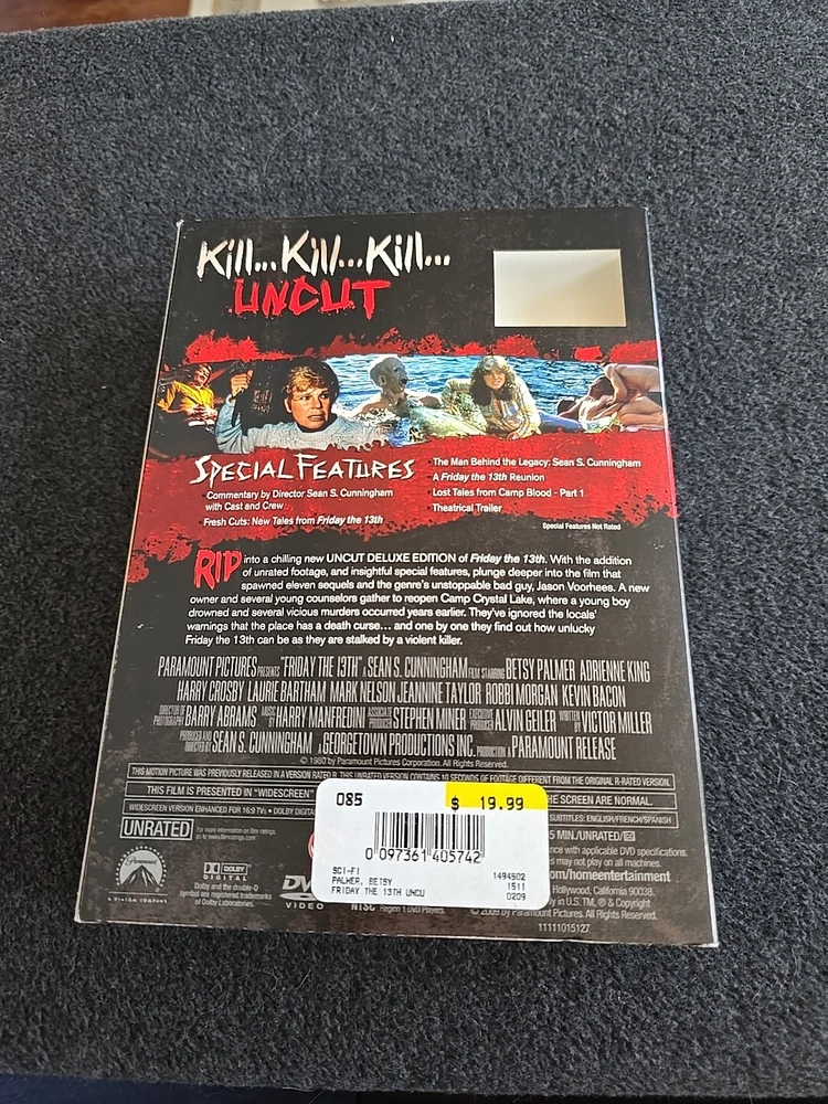 BRAND NEW SEALED WITH OUTER SLEEVE INTACT Experience the terror of the iconic horror movie "Friday the 13th - Part 1" on DVD. This deluxe edition features the original, uncut version of the film from 2009, along with special features such as commentary by the director and cast members. The DVD is formatted for Region 1 (US, Canada...) and is rated R for intense violence and gore. Follow the story of a group of friends who fall victim to a killer on their vacation to Lake Wissota. Starring Adrienne King, Betsy Palmer, and Kevin Bacon, this classic horror movie is a must-have for fans of the genre. Get your hands on this DVD and relive the suspense and terror of "Friday the 13th - Part 1".