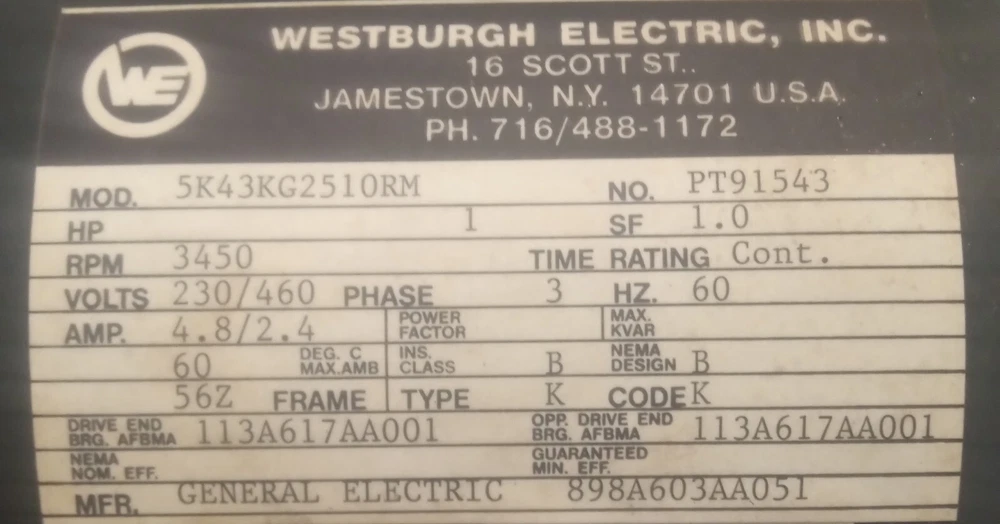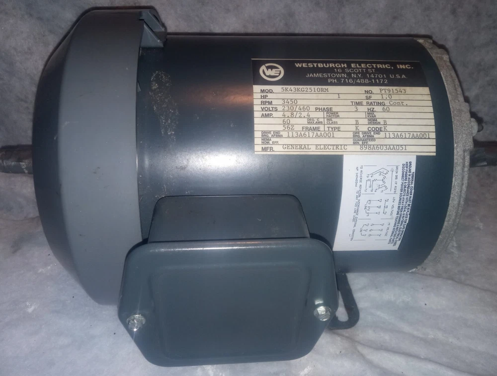 This is a brand new General Electric AC motor with a rated load of 1 horsepower. It has a service factor of 1.00 and operates on three-phase AC current. The model number is 5K43KG2510RM and it has a frequency of 56Z and a RPM of 3450. This motor is suitable for general purpose applications and is part of the Industrial Automation & Motion Controls category.