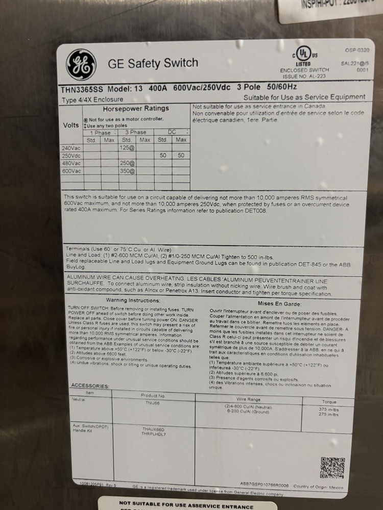 The NEW G.E. THN3365SS Heavy Duty Non-Fusable Safety Switch is designed for industrial applications requiring a high level of safety and reliability. With a 400 amp rating and stainless steel construction, this switch offers durability and corrosion resistance. The sleek stainless steel finish adds a professional look to any electrical setup. The non-fusable design ensures continuous operation, even in the event of a blown fuse, making it ideal for critical systems where downtime is not an option.