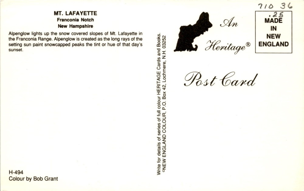 The postcard features a stunning image of Mt. Lafayette in Franconia Notch, New Hampshire, showcasing the alpenglow effect on the snow-covered slopes. Alpenglow is a natural phenomenon where the setting sun's rays illuminate snow-capped peaks with a tint or hue reflecting the colors of the sunset. Mt.