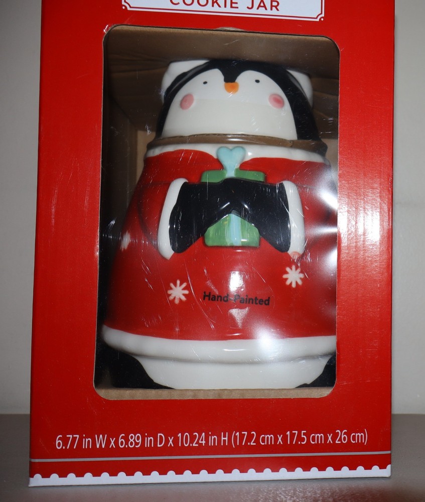 The NEW Holiday Time Christmas Cookie Jar is a beautifully hand-painted ceramic canister featuring a cute red penguin design. This medium-sized cookie jar has one compartment with a twist-off lid, making it a practical and festive addition to your kitchen storage. With its animal print pattern and Christmas holiday theme, this original and multipurpose cookie jar is sure to add a charming touch to your home decor.