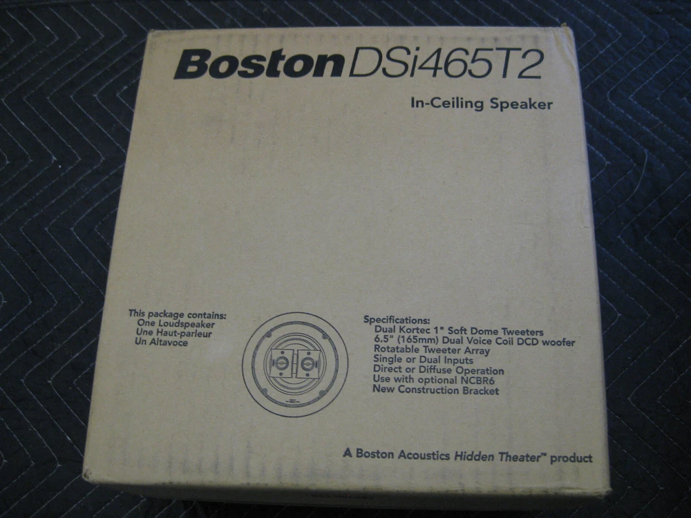 BOSTON ACOUSTICS DSi465T2 NEW IN BOX IN WALL SPEAKER (Single Speaker) Get incredibly flexible performance from a speaker that installs directly into your ceiling. The DSi465T2 from Boston Acoustics, sold individually, Delivers clean, high-impact stereo sound from a single speaker — Perfect for getting great audio in awkward areas like a hallway, bathroom or kitchen. The DSi465T2 has inputs for both left and right channels and two 1" tweeters (one per channel), so you'll hear both halves of the stereo music mix. And a 6-1/2" woofer with dual voice coils takes care of the mids and bass with power and precision. But that's not all. You can also use the DSi465T2 as a single-input dipole/bipole surround speaker in a Boston Acoustics "Hidden Theater™" surround sound system. There's a selectable direct/diffuse switch. Depending on your setup, you can have the two tweeters firing in phase (bipole) for clear, directional sound, or out of phase (dipole) for a more diffuse soundfield. The DSi465T2 makes a great surround speaker matched with a front soundstage composed of the high-performance Brand New in the Box. Original High End Boston and nearly impossible to find New and Unused These were from a local company that was still installing these locally till they closed up their doors and I purchased some of their inventory. All of these I have for sale are factory fresh as they were always stored indoors in a heated facility. NEW PRICE ON THIS SPEAKER WHEN THEY WERE OUT WAS 599.00 stereo input speaker dual 1" Kortec® tweeters 6-1/2" woofer handles up to 100 watts frequency response 60-20,000 Hz (±3dB) sensitivity 91 dB impedance: 8 ohms in stereo input mode, 4 ohms in single input mode selectable direct/diffuse modes paintable, moisture-resistant speaker grille cutout dimensions: 8-11/16" diameter mounting depth: 4-9/16" FAST SHIPPING ON THIS - I SHIP OUT THE SAME DAY OR NEXT AFTER PURCHASE