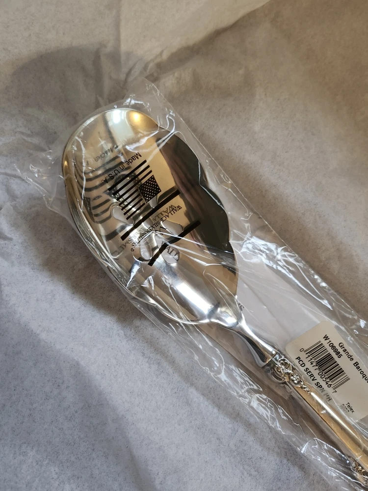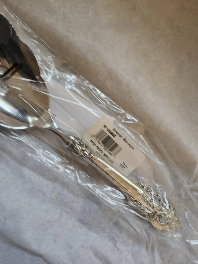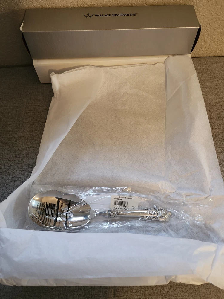 Experience the elegance of the Wallace Grande Baroque sterling spoon, a timeless addition to your servingware collection. With its intricate shell motif and lustrous finish, this piece exemplifies the intricate craftsmanship of post-1940 silverware. New sealed in the plastic. Handle only is sterling. Crafted from high-quality sterling silver spoon is a testament to the enduring beauty of classic design. Its heritage is reflected in the renowned Wallace maker's mark, ensuring authenticity and value. Whether used for special occasions or as a standout display piece, this spoon promises to be a cherished heirloom.