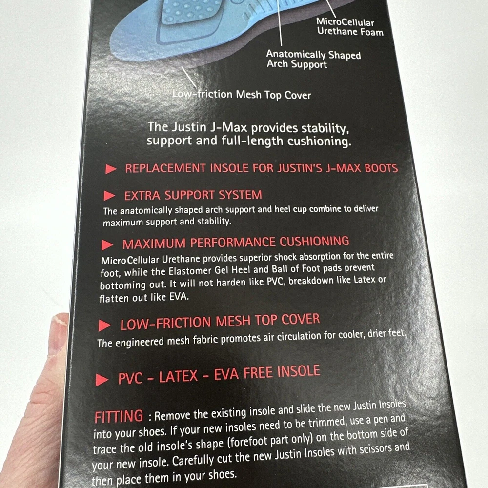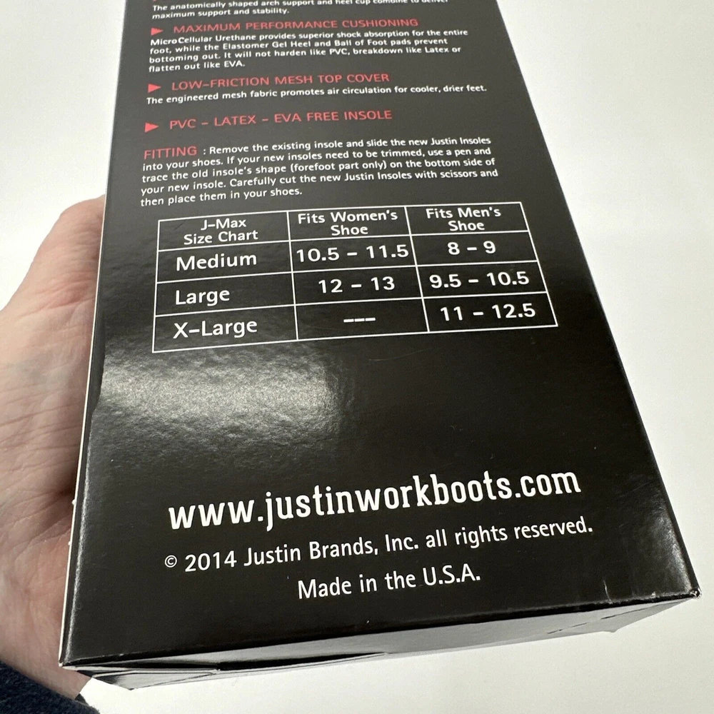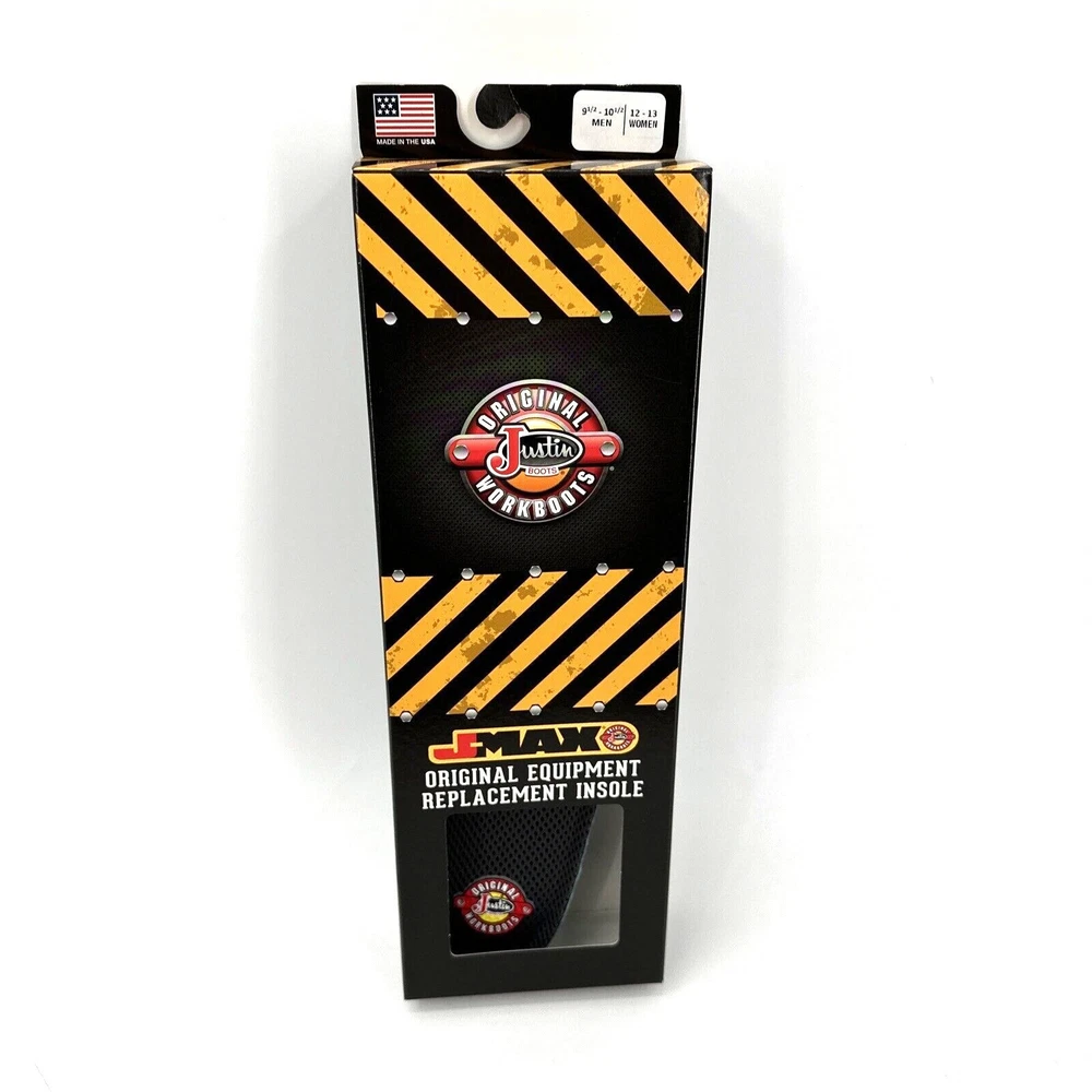 Justin Workboots J-Max Original Equipment Replacement Insoles Size Large Men's 9.5 - 10.5 Women's 12-13 Brand new in original box, see all pictures for views. Ships out same day or next open postal day. Thank you for your purchase, we appreciate you!
