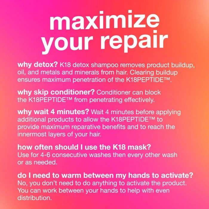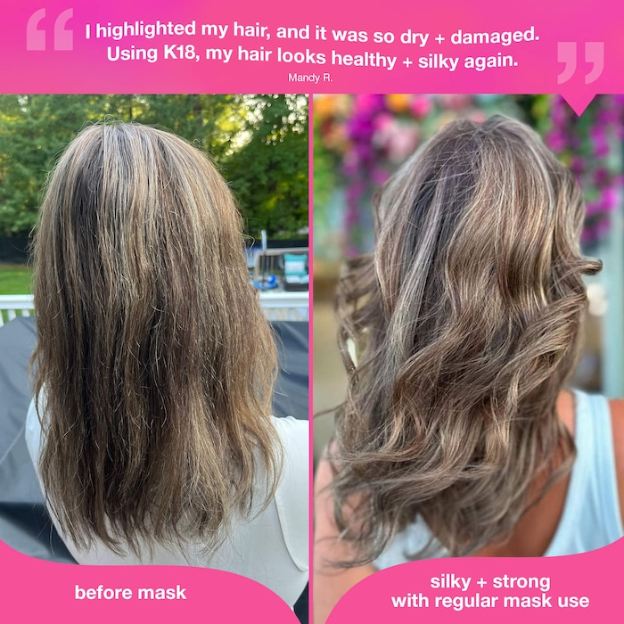 Only at Sephora What it is: A leave-in treatment mask for all hair types that clinically reverses damage in four minutes. The patented peptide technology works to repair damage from bleach, color, chemical services, and heat, restoring strength, softness, smoothness, and bounce to hair. Hair Type: Fine, Medium, and Thick Hair Texture: Straight, Wavy, Curly, and Coily Hair Concerns: - Damage/Split Ends/Breakage - Color Safe - Straightening/Smoothing Key Benefits: - Restores strength, softness, smoothness, and bounce - Repairs damaged hair - Easy leave-in formula delivers lasting results Highlighted Ingredients: - K18Peptide™: Repairs damage from bleach, color, chemical services, and heat. Ingredient Callouts: This product is vegan, cruelty-free, and comes in recyclable packaging. What Else You Need to Know: This mask is powered by the patented K18Peptide, which is just the right size and molecular structure to reach the innermost layers of hair and re-connect broken keratin chains responsible for hair's strength and elasticity. Fragrance Description: The light floral scent features notes of jasmine and peony. Clinical Results: In a clinical study on hair that was bleached 8 times, after 2 uses: - Biotech-powered K18Peptide restored damaged hair by up to 82%