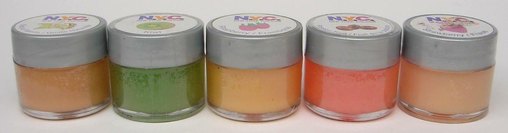 This Lot INCLUDES : FIVE different flavors of SEALED New York Color (NYC) FRUIT FLAVORED LIP GLOSS in lip balm jars, including ONE EACH of: 501A STRAWBERRY 502A RASPBERRY 503A NATURAL VANILLA 504A KIWI 506A PASSION FRUIT These are discontinued, and getting hard to find, but I found a few - get 'em while they last! All are still SEALED ; each jar contains 8 grams. * * * ALL 5 FOR ONE LOW PRICE! * * * Please keep checking Saler's other items for MORE of the Neat & Unique! Be sure to add me to your favorites list ! Sign up for my email newsletters by adding my eBay Store to your Favorites Additional Keywords: Makeup, Discontinued, retired, OOS, Out Of Stock, Legacy, collectible