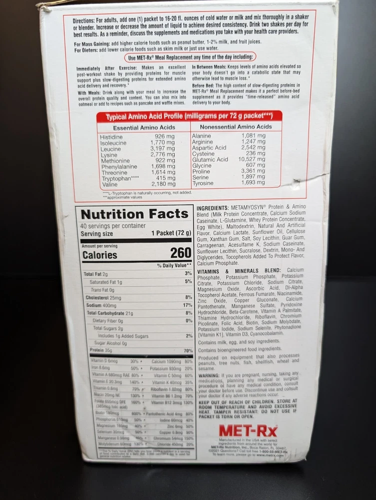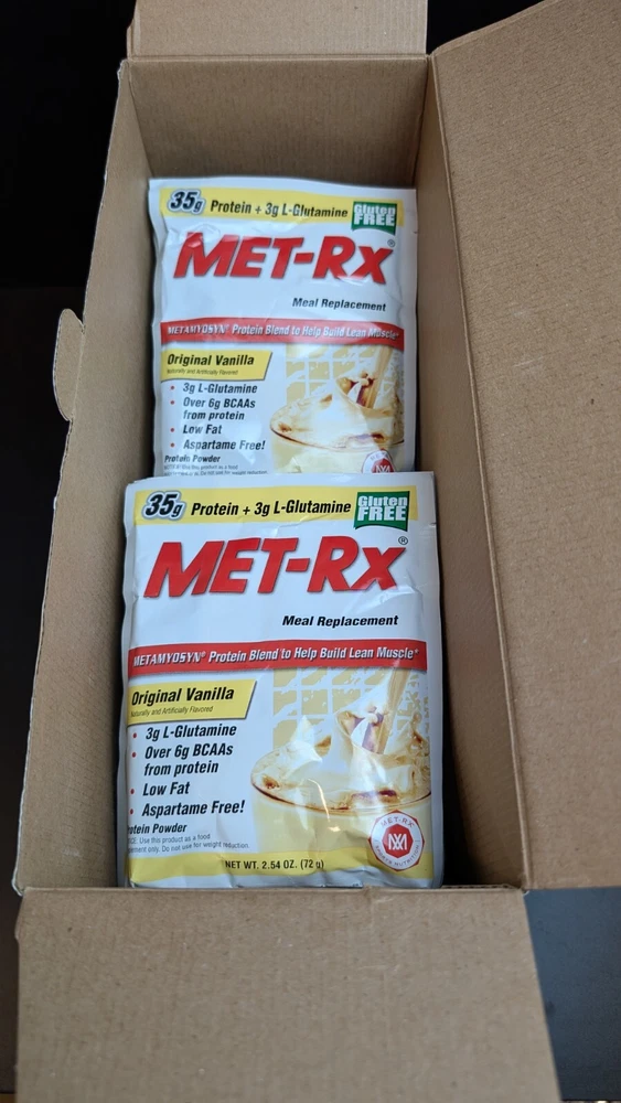 THIS is a LISTING FOR MET-RX MEAL REPLACEMENT PROTEIN POWDER PACKS VOLUME: 40 PROTEIN POUCHES EXPIRATION: 07/2024 Product details MET-Rx “ORIGINAL” MEAL REPLACEMENT revolutionized sports nutrition with the METAMYOSYN® Protein Blend! The “Original” MET-Rx® Protein Meal Replacement nutrition shake is back and better than ever with an upgraded formula that is free of aspartame and hydrogenated fats while still featuring the exclusive METAMYOSYN® Protein Blend. COMPLETE PROTEIN BLEND TO SUPPORT LEAN MUSCLE. Originally developed by a physician, METAMYOSYN® protein is based on metabolic research to help support lean muscle mass. METAMYOSYN® combines Milk Protein with slow-acting casein, plus L-Glutamine. Milk Protein is a natural source of whey and casein, for fast and slow digesting properties, and each protein source within METAMYOSYN® provides naturally occurring Branched Chain Amino Acids - Isoleucine, Leucine and Valine. The precise combination of proteins in METAMYOSYN® offers a sustained release of amino acids and provides your body with a highly bioavailable fuel that helps support lean muscle mass and strength. *Use in conjunction with an intense daily exercise program and a balanced diet including an adequate caloric intake 39g of Protein per serving; 100% DV Calcium for bone and nutritional health; 25 Essential vitamins and minerals UNITED STATES BUYERS ONLY PLEASE CHECKOUT MY OTHER AUCTIONS THANKS!