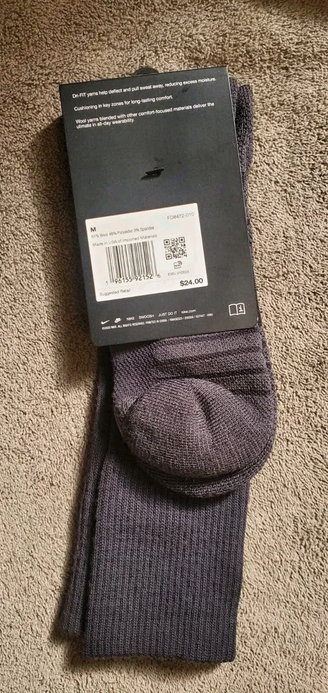 Type: Socks Character: Snike Features: Breathable, Moisture Wicking Color: Black Pattern: Striped Theme: Outdoor Brand: Nike Size Type: Regular UPC: Does not apply Number in Pack: 1 Department: Men Size: M Performance/Activity: CrossFit, Golf, Gym & Training, Hunting, Walking Style: Outdoor Socks Country/Region of Manufacture: China Season: Fall, Spring, Summer, Winter Sock Length: Mid Calf Material: Polyester, Wool MPN: FD8472010 Occasion: Business, Casual, Workwear Toe Style: Full Toe Handmade: No gtin13: Does not apply Personalize: No