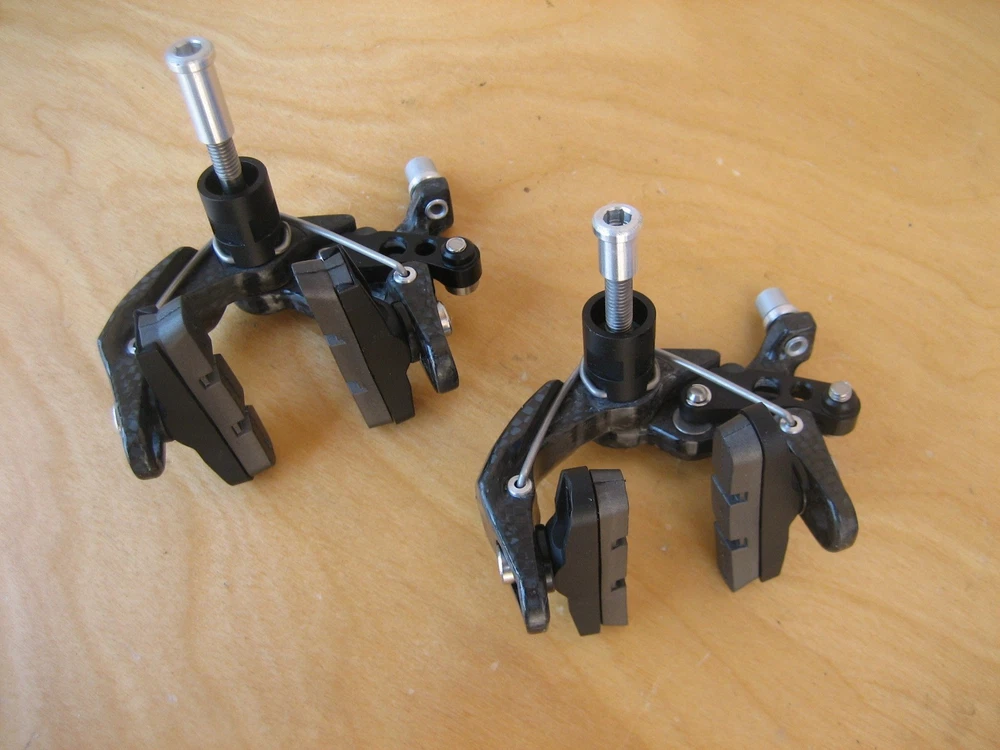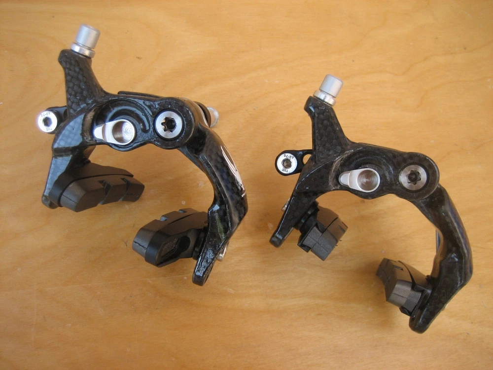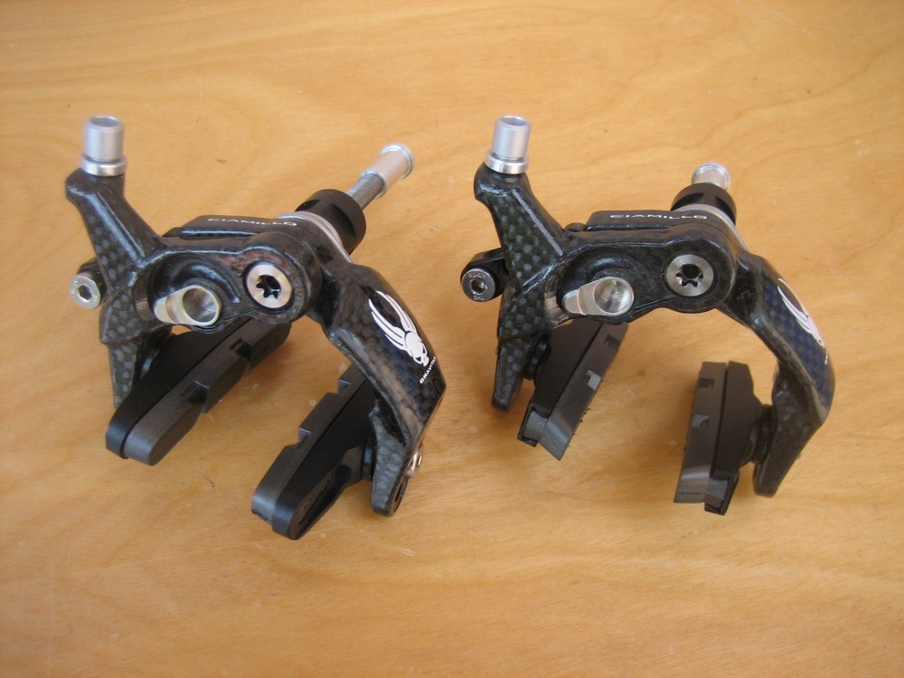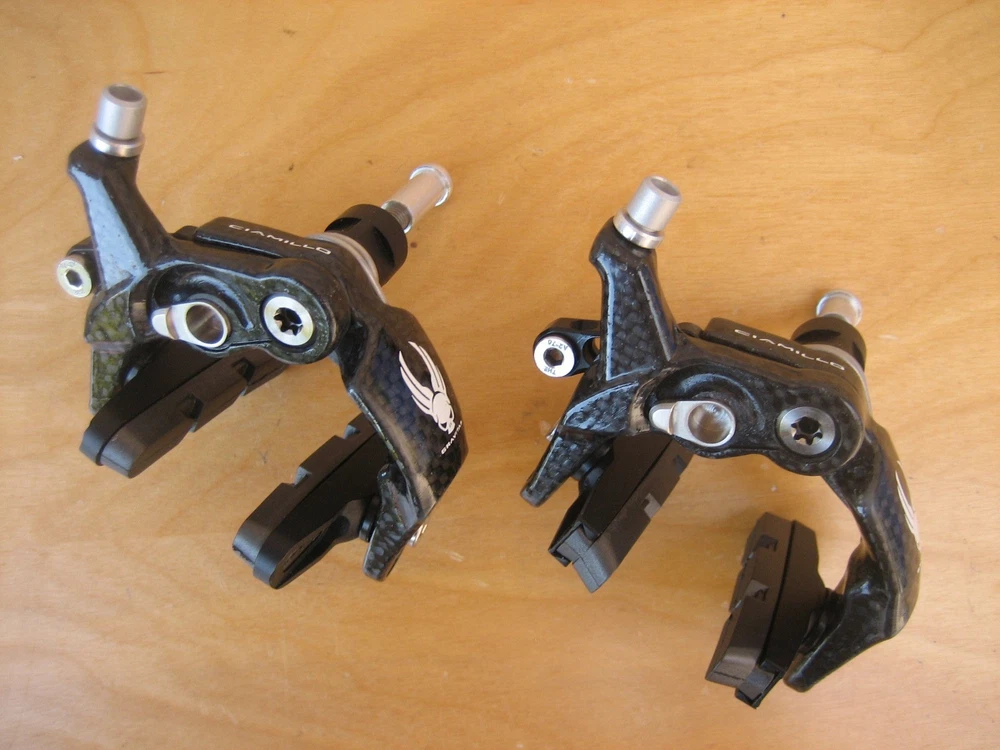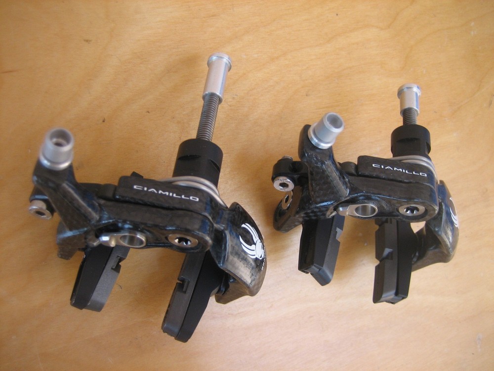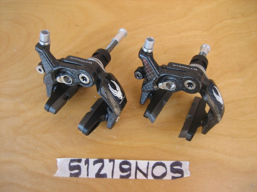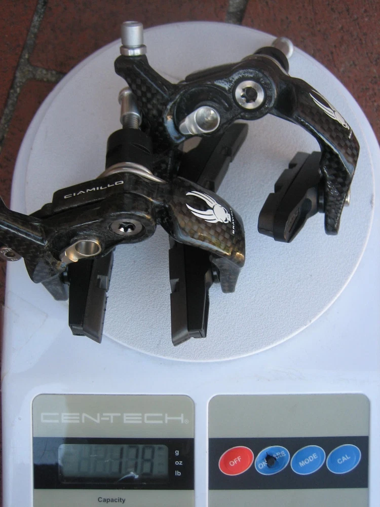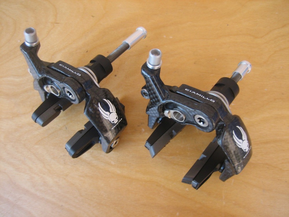 Ciamillo Zero Gravity Gravitas Brakes (Campagnolo Record, Dura Ace, SRAM Qual.) 172 grams (pair) 179 grams total weight with pads (pair) Full carbon fiber arms Titanium hardware Cam Advantage Leverage - power increases exponentially rather than linearly Most powerful brake Ciamillo has ever made Pad to pad dimension is 25mm. The lightest and strongest brakeset ever made with a higher power/weight ratio than the legendary Ciamillo GSL. The caliper arms are manufactured from molded and milled molded carbon fiber. The cam, barrel adjuster and lower profile pad holders are made of Aluminum and the hardware is all made from Titanium. The ultra low profile makes these brakes incredibly aerodynamic. As a set the Gravitas weigh a 172 grams. That's 78 grams lighter than Sram, 100 grams lighter than Super Record, 120 grams lighter than Dura Ace! Ciamillo's Cam design gives the brakes a progressive feel and superior modulation. Will be shipped with signature confirmation.