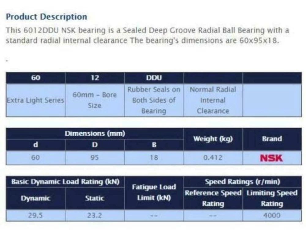 Description This 6012DDU NSK bearing is a Sealed Deep Groove Radial Ball Bearing with a standard radial internal clearance The bearing's dimensions are 60x95x18. Brand: NSK MADE IN JAPAN Package Includes: One (1) 6012DDU NSK bearing On Dec 12, 2024 at 23:26:49 PST, seller added the following information: