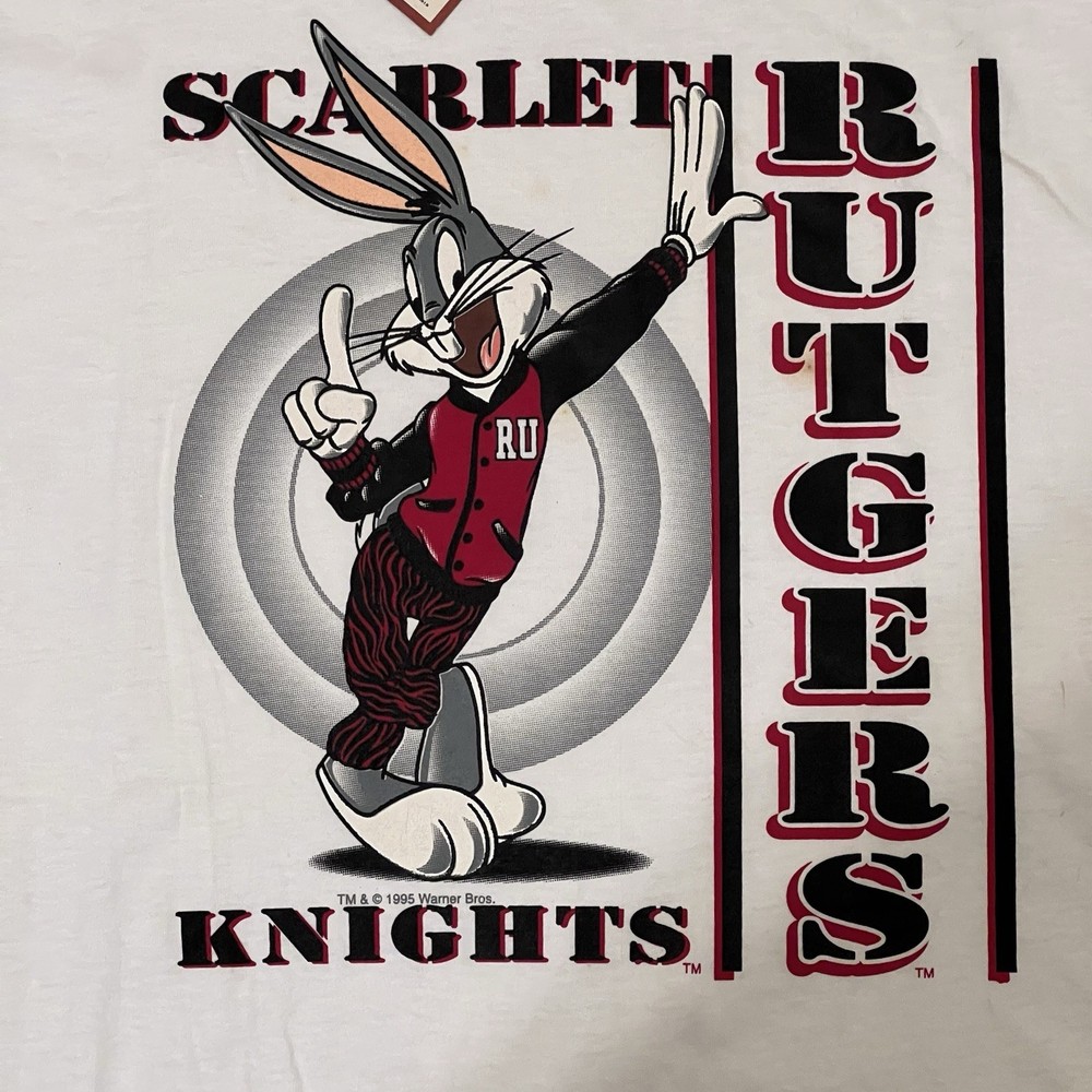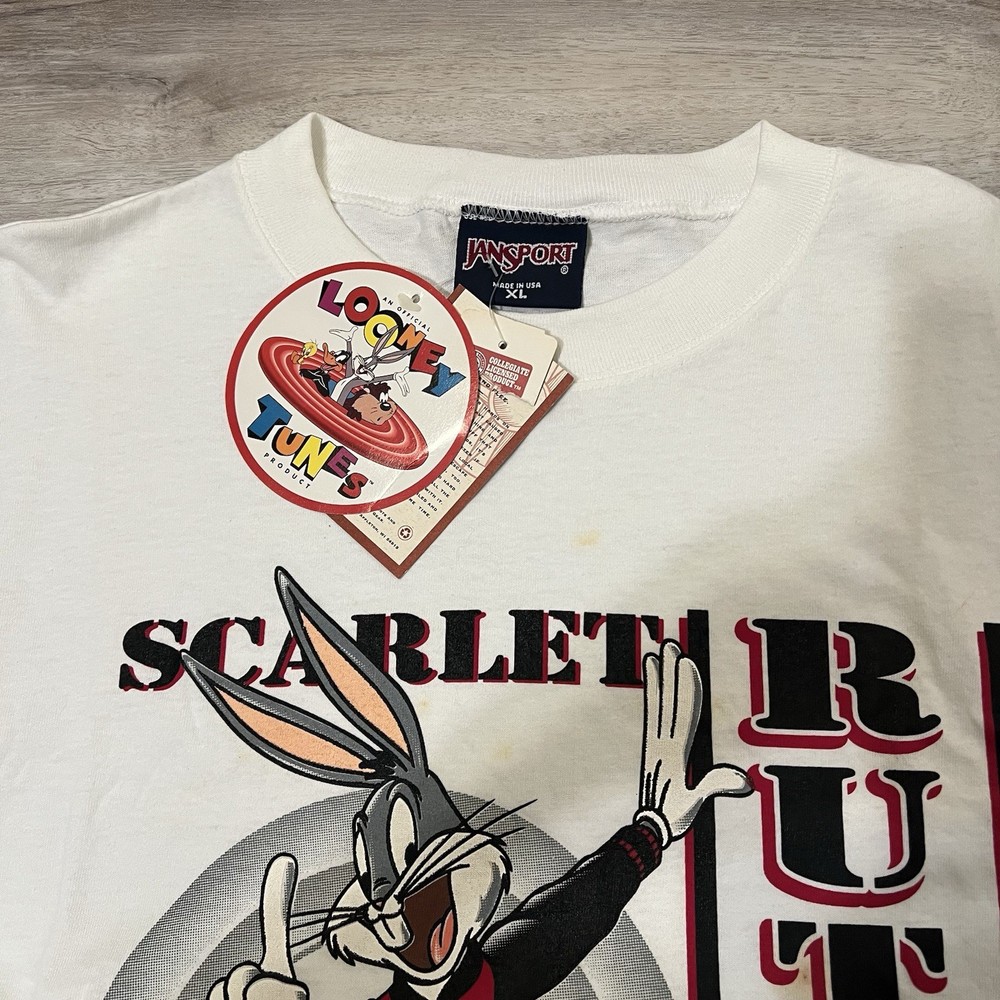 The Vintage Looney Tunes Scarlet Knights Rutgers College T-Shirt in size XL features a classic design with short sleeves and a crew neckline. Made from cotton material, this multicolor shirt is machine washable and suitable for all seasons, particularly perfect for summer and spring. The shirt showcases a college theme with Looney Tunes branding and is a regular fit for men. Made in the United States, this shirt is a unique addition to any collection of vintage clothing.