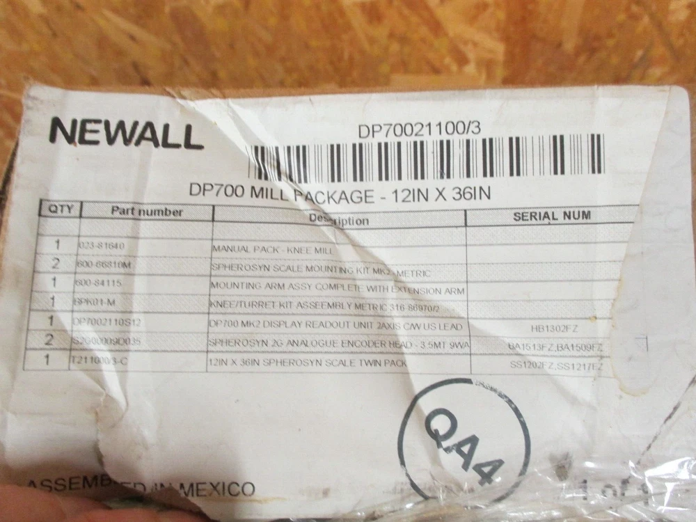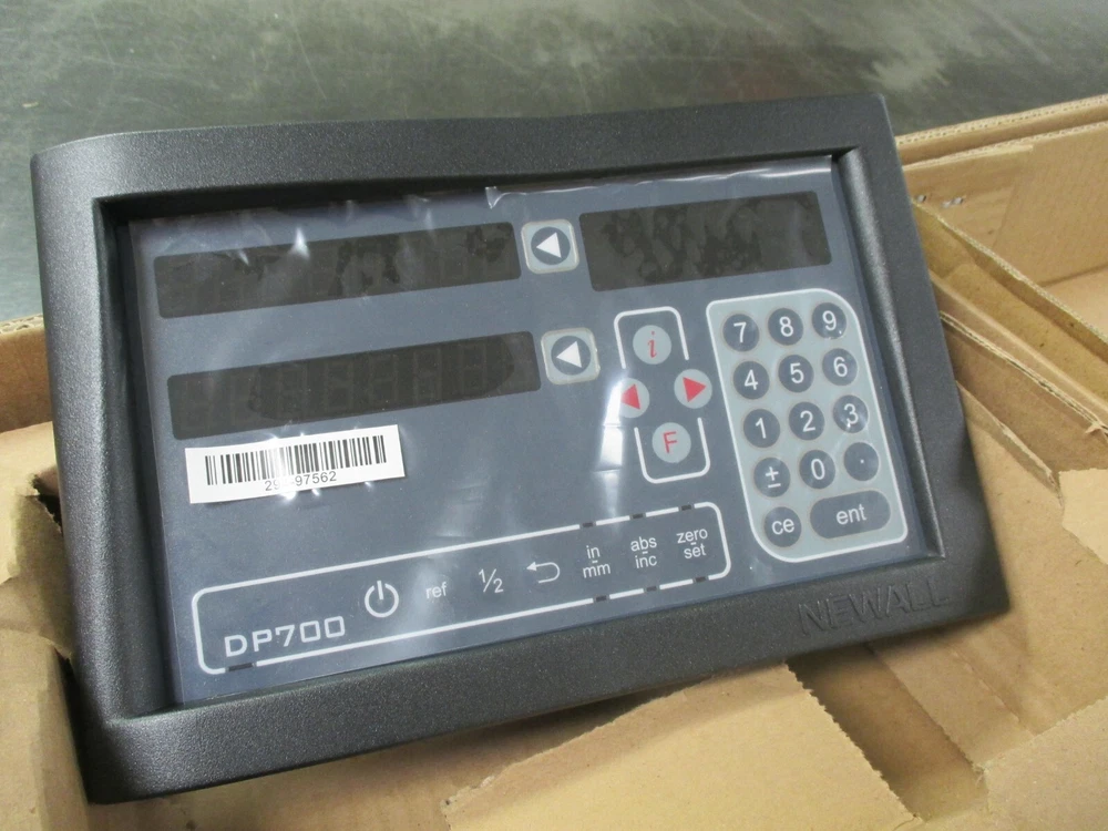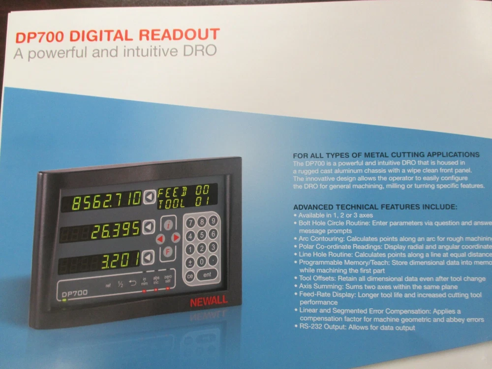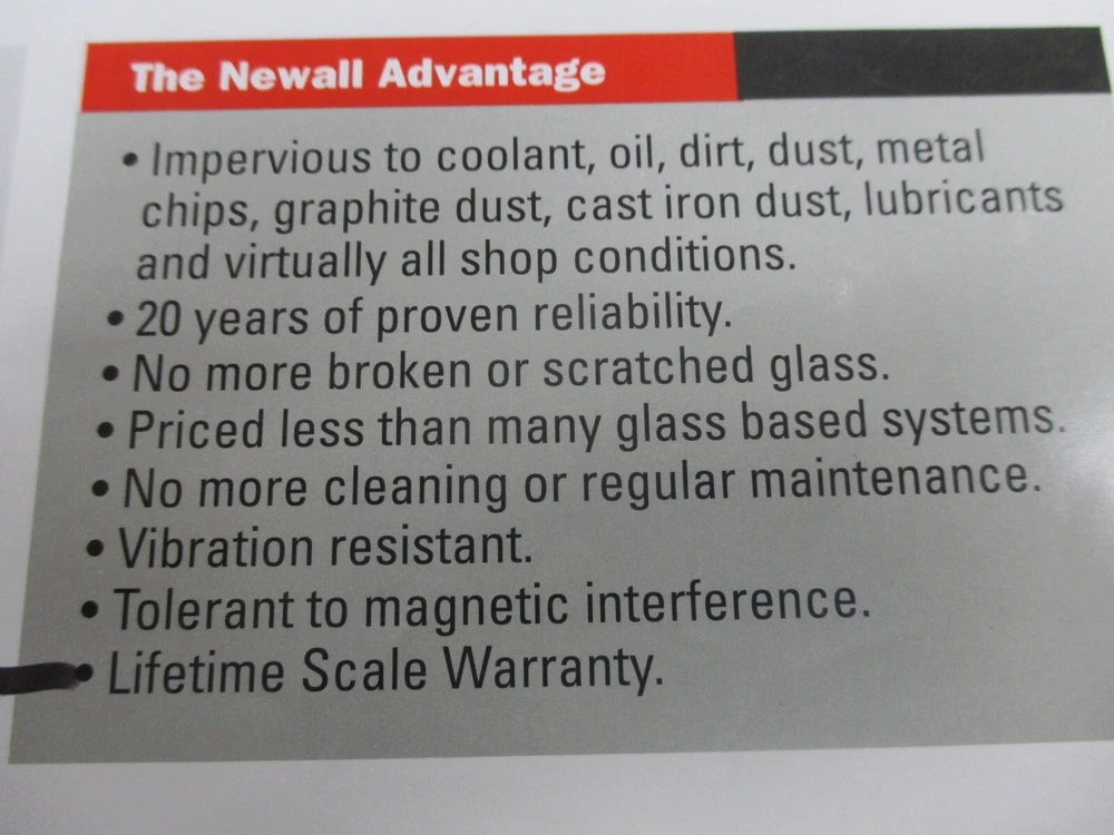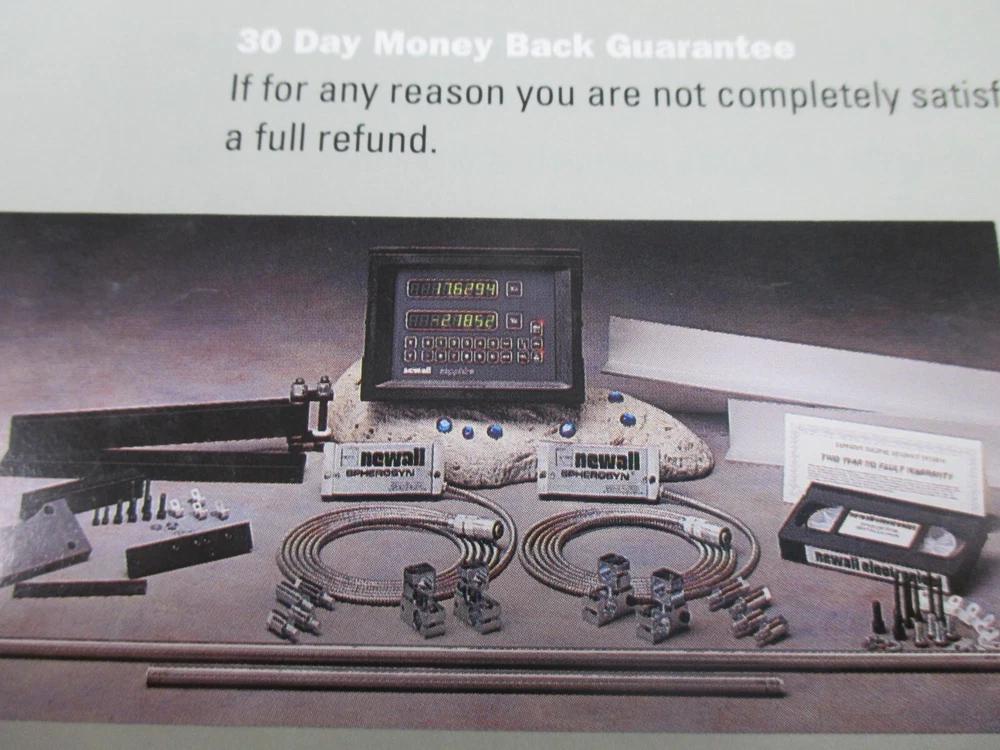This is a NEW DP700 Newall 12"x36" travel digital readout milling machine package that includes all the hardware for mounting on your 9"x49" table on your knee mill! (Does not include VCR tape pictured) THESE ARE TRAVELS on the scales, not the lengths of the scales, so keep that in mind! It includes a DP700 2-Axis Counter and a 12" Spherosyn Scale for the cross travel with a 36" Spherosyn Scale for the longitudinal table travel, along with all the scales, brackets and cables to mount it and use it! DP700 counter features bolt hole circle routine, arc contouring, line hole routine, tool offsets, axis summing, feed rate display, RS232 output and more! It also includes a Counter Display Arm Mounting Kit for mounting the counter on top of your ram for easy viewing. It is new and still in its original boxes per the pictures shown. All the items are marked with serial numbers and recorded with Newall and we are a distributor for them, again, brand new and in the original boxes! New this kit is $2605.00 and we are selling it at over 15% off, so a pretty good buy for someone in the Ebay World! Or if local, pick it up and pay no freight! INSTALLATION IS ALSO AVAILABLE IN N.W. OHIO! Check out our Ebay Store and Sign up for our email newsletters by adding my eBay Store to your Favorites! Ever in the Toledo Ohio area? Stop in our retail store and get a copy of our 450+ page T&S Catalog! (ID #041724-2) E b a y Stores And check out our website with over 300,000 items in stock! Visit our website, available at our Ebay Store Site, for a complete listing of all our products and vendors. It is fully interactive and will show you current pricing and stock availability on thousands of items! We take all the major credit cards and the website features fully automated UPS shipping and now available.... PayPal ! And anonymous or one time buyers can place credit card orders right online! Or register today & open an account to place orders, print statements, expedite orders and more! Also listed will be our toll free telephone and fax numbers for your convenience. Get your copy of our 450 page T&S Catalog, with listings of popular items from all the companies we represent. Direct Links to all our vendors which include some of the top names in the industry; Kennedy, OSG, Guhring, Clausing, Jet, Precision Twist-Dormer, Wilton, Norton, Starrett, Allied, Mitutoyo, YG-1 Keo, Brown & Sharpe and Jacobs, just to name a few! WE SPECIALIZE IN CUTTING TOOLS! Hundreds of decimal reamers, including over and under size metric reamers from 1mm to 20mm.....a T&S EXCLUSIVE! Hundreds of special taps from #000 to 4", endmills, toolholders, abrasives, fasteners, machinery and much more. Experienced sales staff...large inventory...competitive pricing...give us a call! THANKS FOR SHOPPING...T&S!