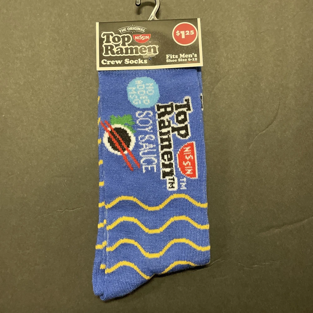 Add some fun to your sock collection with these Nissin Top Ramen Soy Sauce Socks. These unisex crew socks feature a solid blue background with many yellow squiggly lines and the Top Ramen logo, making them perfect for any foodie. The mid-calf length and full toe style provide a comfortable fit for walking and other activities. Made from a blend of polyester and spandex, these socks are lightweight and breathable, ensuring your feet stay fresh throughout the day. With a pack of one pair, these socks are perfect for anyone looking for a unique and comfortable addition to their wardrobe. Whether you're a fan of Top Ramen or just love novelty socks, these Nissin Top Ramen Soy Sauce Socks are a must-have.