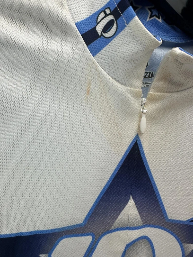 NEW Pearl Izumi Junior LTD jersey, size large. This is a new jersey, but there is a dirty spot on the right front chest. I've adjusted the price to reflect this. It will probably come clean once washed, but I am not sure. Armpit to armpit measures 16". Front collar to bottom of the jersey measures 19". $7.00 Shipping in the USA. International buyers to pay $25.00. NEW Pearl Izumi JUNIOR LTD JERSEY Blue/White LARGE NEW Pearl Izumi JUNIOR LTD JERSEY Blue/White LARGE Click images to enlarge Description NEW Pearl Izumi Junior LTD jersey, size large. $50 retail. This is a new jersey, but there is a dirty spot on the right front chest. I've adjusted the price to reflect this. It will probably come clean once washed, but I am not sure. Armpit to armpit measures 16". Front collar to bottom of the jersey measures 19". $7.00 Shipping in the USA. International buyers to pay $25.00. Images sell! Get Supersized Images & Free Image Hosting Create your brand with Auctiva's Customizable Templates. Attention Sellers - Get Templates Image Hosting, Scheduling at Auctiva.com. Track Page Views With Auctiva's Counter