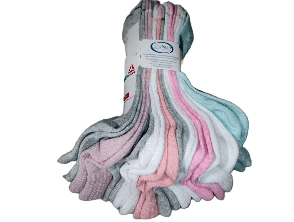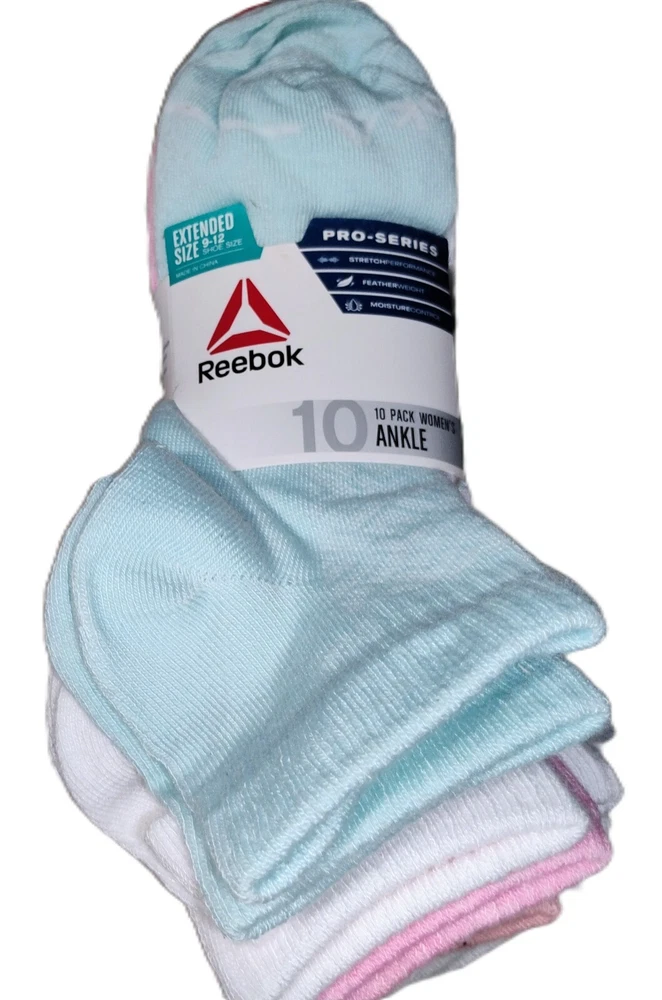 These are Reebok Pro-Series Ankle Socks in extended size 9-12, featuring a pack of 10 pairs in pink, gray, and white colors. The socks are made of Lycra, polyester, and spandex, with cushioned and moisture-wicking features. Designed for women, they have a low-cut style with full toes, suitable for activewear and everyday use. Ideal for sports activities like gym training, cross training, and CrossFit, these breathable socks are machine washable and suitable for all seasons.