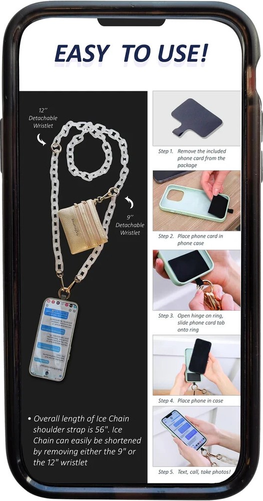 ICE PURPLE CHAIN CLIP & GO STRAP Cellphone Cross Body Acrylic Chain and Pouch by SAVE THE GIRLS POUCH AND CHAIN IN THE 1st PICTURE ARE WHAT YOU WILL RECEIVE AND CONTENTS ARE NOT INCLUDED!! OTHER PICTURES ARE FOR REFERENCE ONLY! This attractive, extremely comfortable, cross body shoulder strap offers more than meets the eye! The multifunctional design allows your phone to hang at your side hands free, while the included innovative hanging phone card, convenient zippered change pouch and detachable wristlet combine to create a product that has undeniable global appeal. Features: Included Hanging Phone Card, converts your phone case into a hanging cross body carrier Beautiful and extremely comfortable, adjustable cross body shoulder strap, with removable wristlet Comes complete with a cute hanging (3) zippered change pouch. Carry cash, credit cards, change, and small items Removable, adjustable, cross body shoulder acrylic chain can easily be used on other purses Dimensions: Adjustable Shoulder Acrylic chain: 49" to 55" long Zippered Pouch: 4.5" wide x 3.5" tall w/3 zippered compartments Thank you for looking!!! For more of what a woman loves, be sure to check out our other items in our eBay Store The Bead 'n Bag Lady!