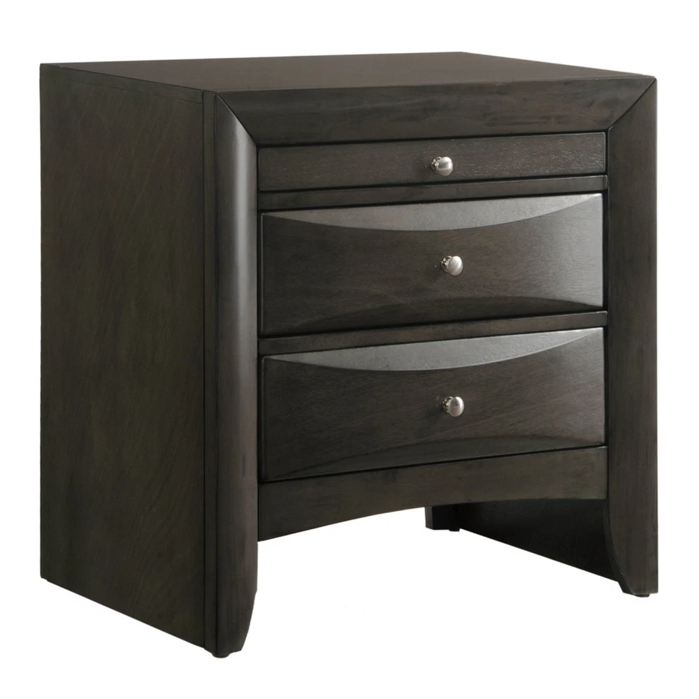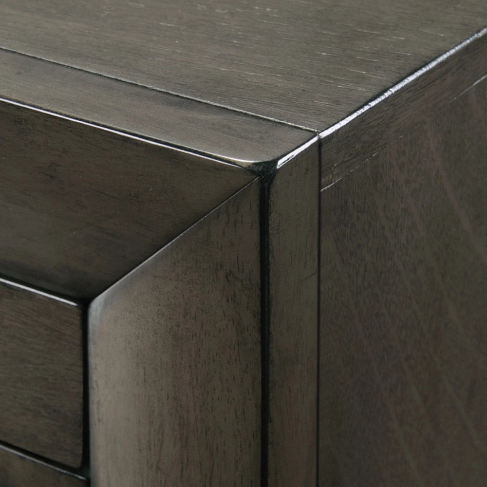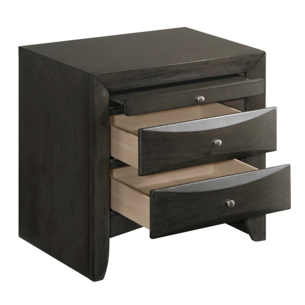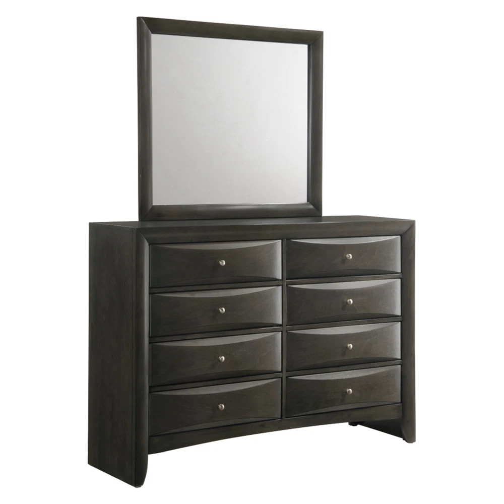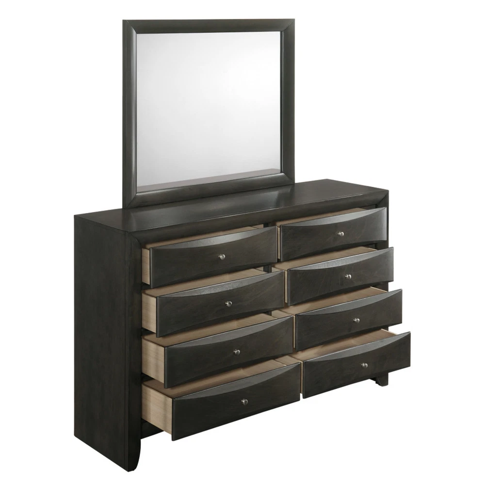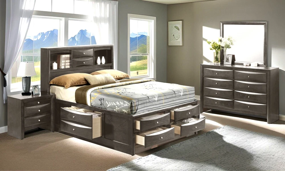 Brand: CM Set Includes: 18-Storage Drawers, Bedside Table, Bedframe, Dresser, Mirror Number of Shelves: 2 Compatible Mattress Size: Queen, King Room: Bedroom Style: Modern, Contemporary, Traditional Color: Gray Number of Drawers: 18 Finish: Gray Handle Finish: Silver Number of Items in Set: 4 Assembly Required: Yes Material: Hardwood
