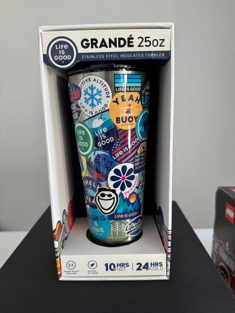 Fast Shipping! Enjoy your beverages at any occasion with this stylish Tervis Life Is Good Stainless Steel Tumbler. Featuring a fun and upbeat Life is Good Stickers design, this tumbler is perfect for teens and adults who love to add a little flair to their drinkware collection. With a 25 oz. capacity, this tumbler is great for both hot and cold drinks, and its double wall insulated construction ensures that your drink stays at the desired temperature for longer. This tumbler is made of high-quality 18/8 stainless steel, which is BPA-free and contains no toxins. Its sweat-free design makes it easy to hold, while the cup lid and two straws make it convenient to drink. Hand wash only to keep your tumbler looking its best. Add this Life is Good Stainless Steel Tumbler to your collection today, and enjoy your favorite drinks in style!