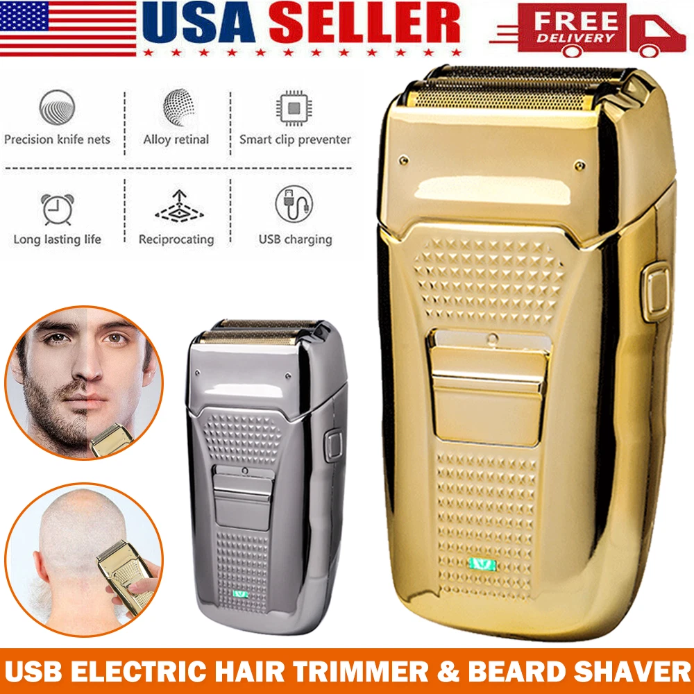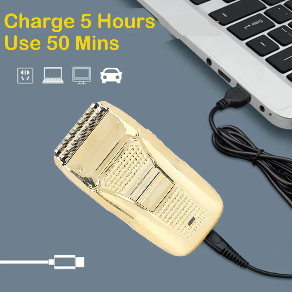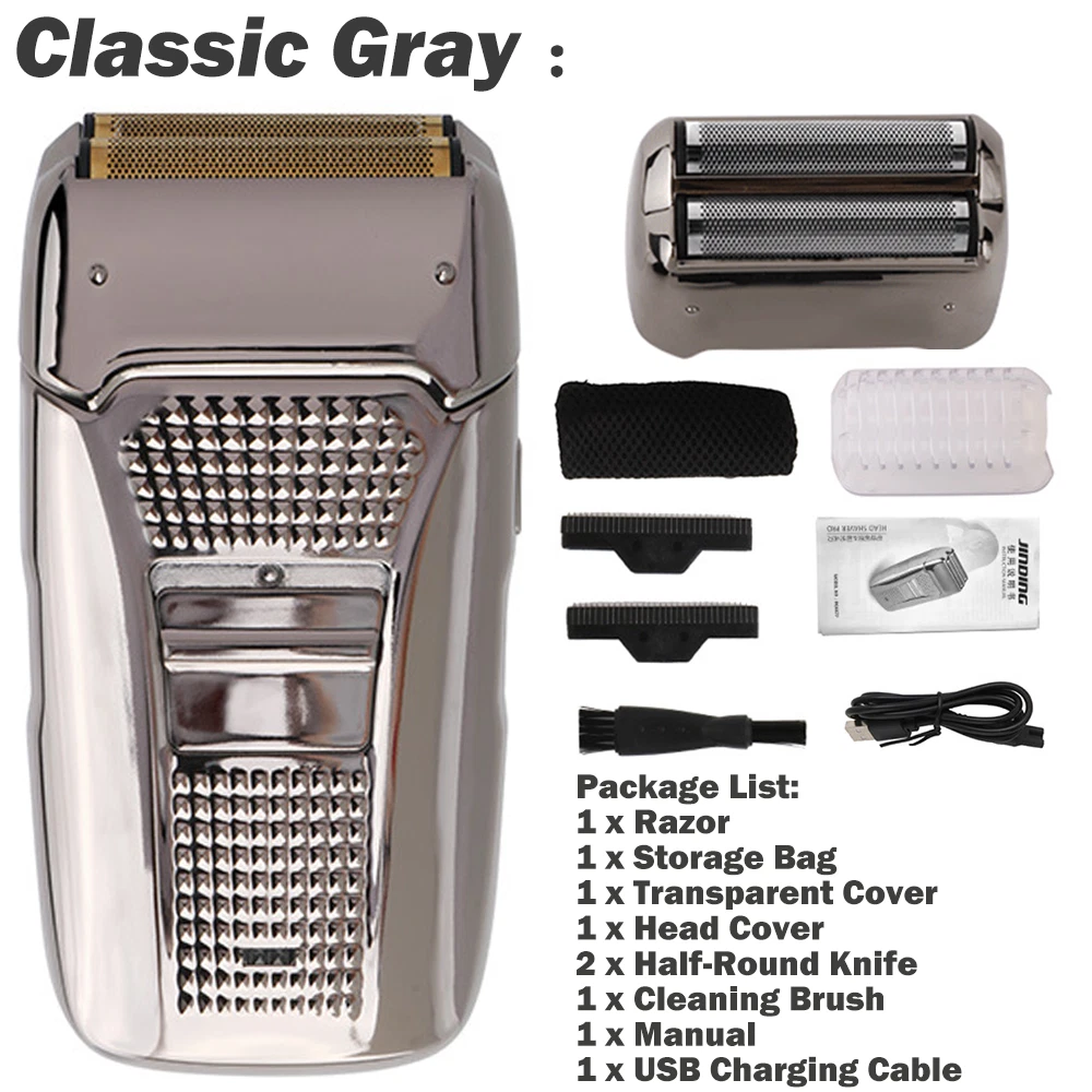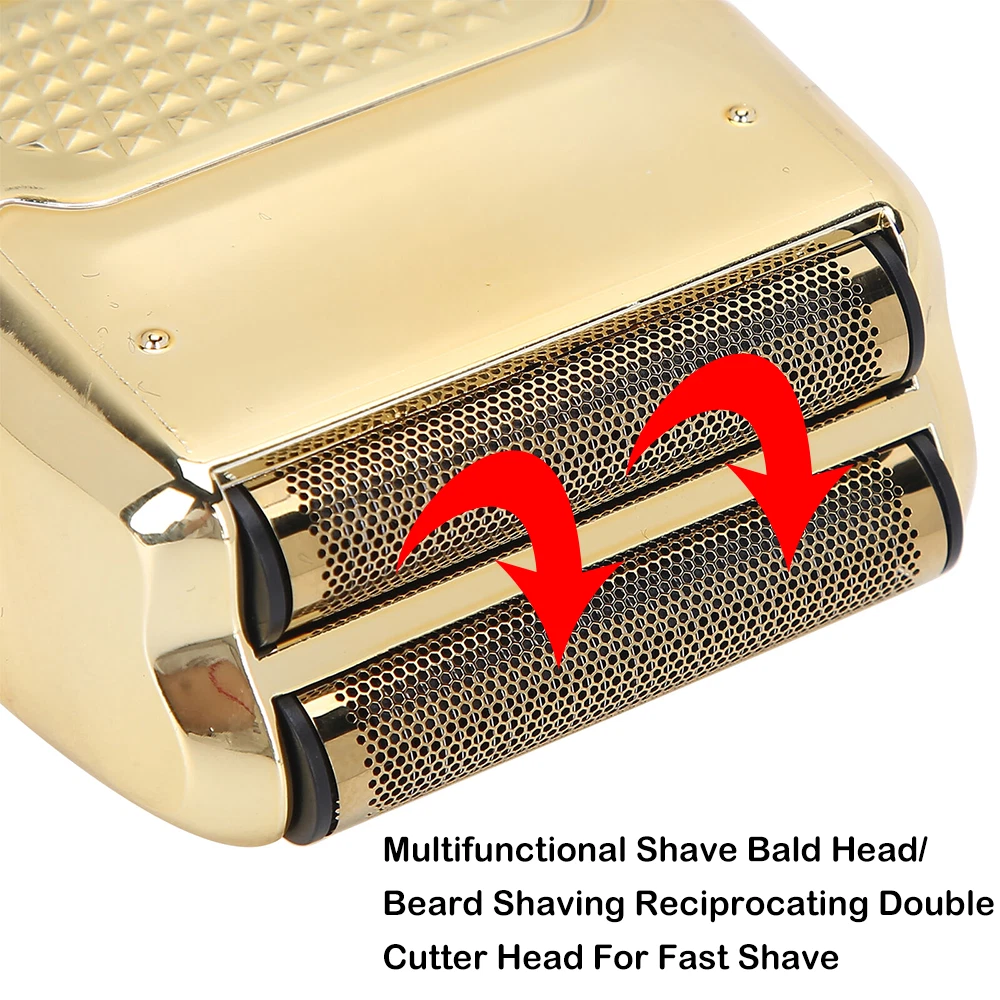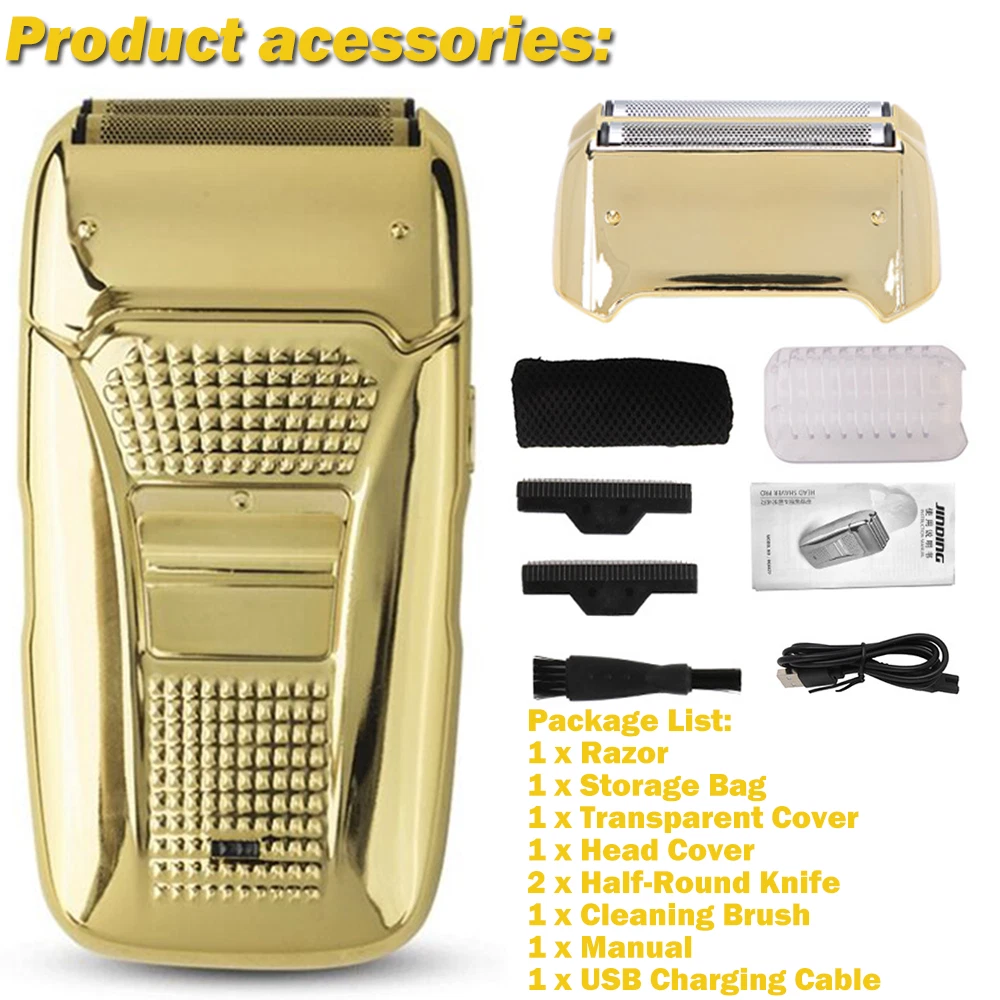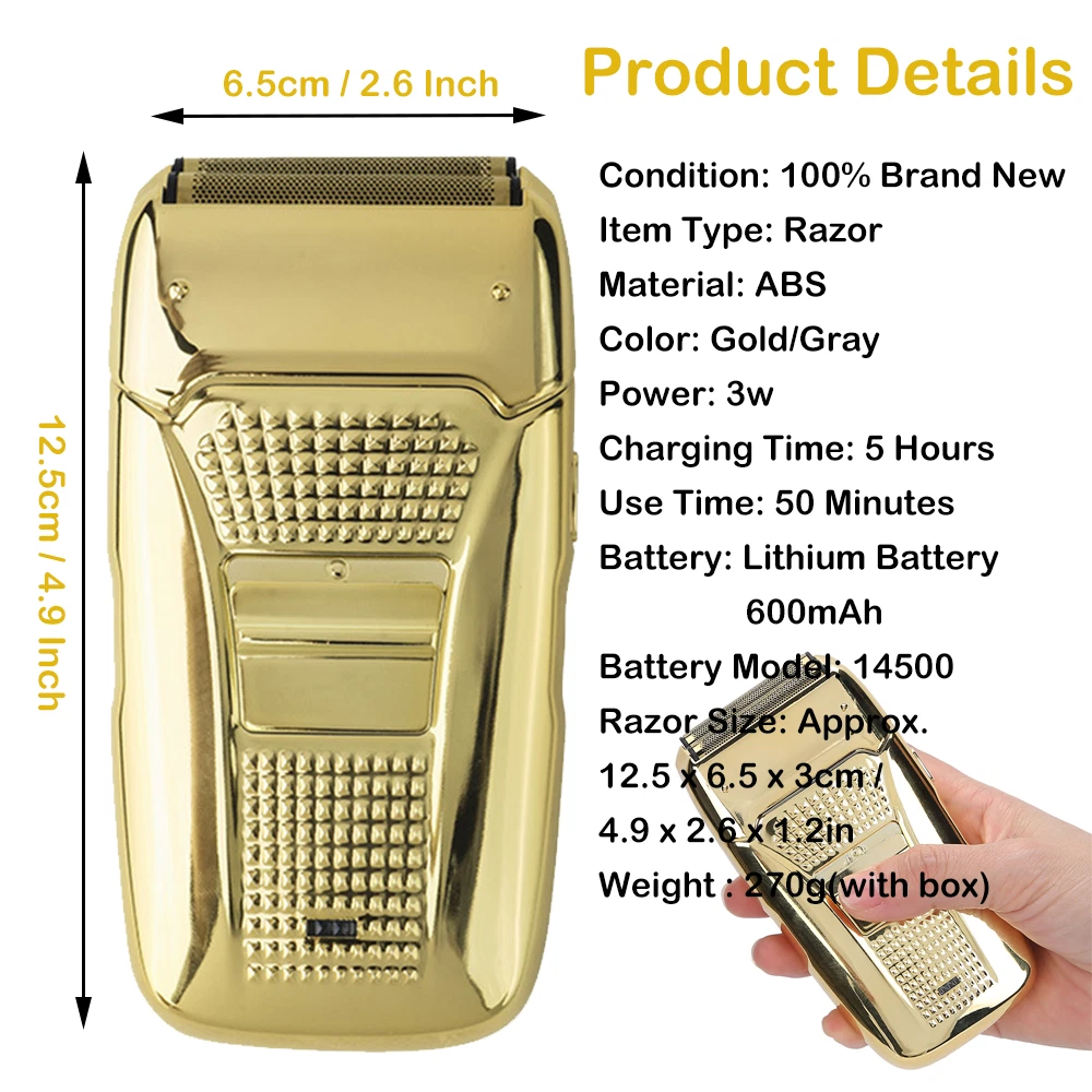 Des c ri p tion: Comfortably Fits Facial Contours: Alternate shaving design, elastic facial adjustment system, conforms comfortably to facial contours, no residue after shaving. Double Blade Design: Slim Screen Knife Net, Floating Face Adjustment to Quickly Capture Beard. Double blade design, fast cutting beards, incisive and not glued. Dual-purpose charging plug: Dual-use charging and plug, USB charging design, equipped with USB charging cable, can be connected to a variety of USB power ports, convenient charging. Multifunctional: Multifunctional, can be used to shave the bald head and shave the beard. Conforms to the ergonomic design, easy to grip and use. Easy to carry: Light and small in size, equipped with a storage bag, easy to carry when going out. Condition: 100% Brand New Item Type: Razor Material: ABS Color: Gold/Gray Power: 3w Charging Time: 5 Hours Use Time: 50 Minutes Battery: Lithium Battery 600mAh Battery Model: 14500 Razor Size: Approx. 12.5 x 6.5 x 3cm / 4.9 x 2.6 x 1.2in Weight : 270g(with box) Package List: 1 x Razor 1 x Storage Bag 1 x Transparent Cover 1 x Head Cover 2 x Half-Round Knife 1 x Cleaning Brush 1 x Manual 1 x USB Charging Cable